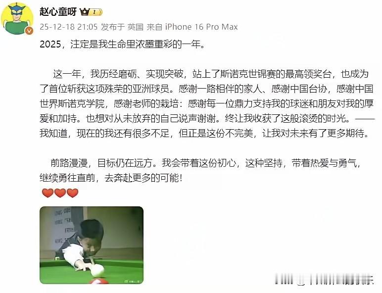 目标就在远方!赵心童短短的几个字一张图片,诉说了现在,期待了将来,也回忆了过去。 不可否认,再不满意赵心童他也树立了中国斯诺克的一座高峰,就因为登的太高也领略到了高处不胜寒。 一张童年照片无疑更让人心情平静,也会牢记那份为了爱好的美好回忆,平静下也显露出那份不平静,赵心童感受到了,本不需要感谢,需要的是不断的征服每一座高峰。 末尾给了回应,前路漫漫,就有了许多可能,既然他还在路上,就值得继续去期待。