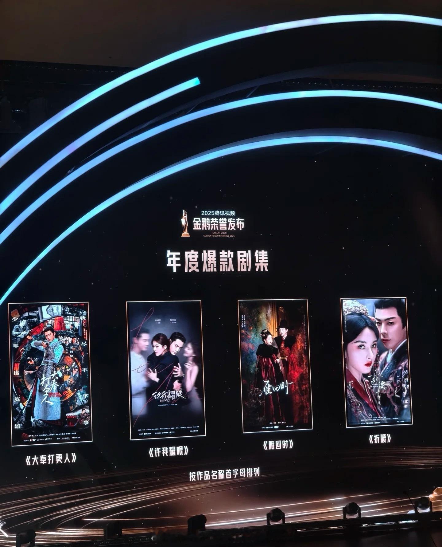 腾讯视频年度爆款剧集:王鹤棣《大奉打更人》赵露思、陈伟霆《许我耀眼》陈都灵、辛云来《雁回时》宋祖儿、刘宇宁《折腰》