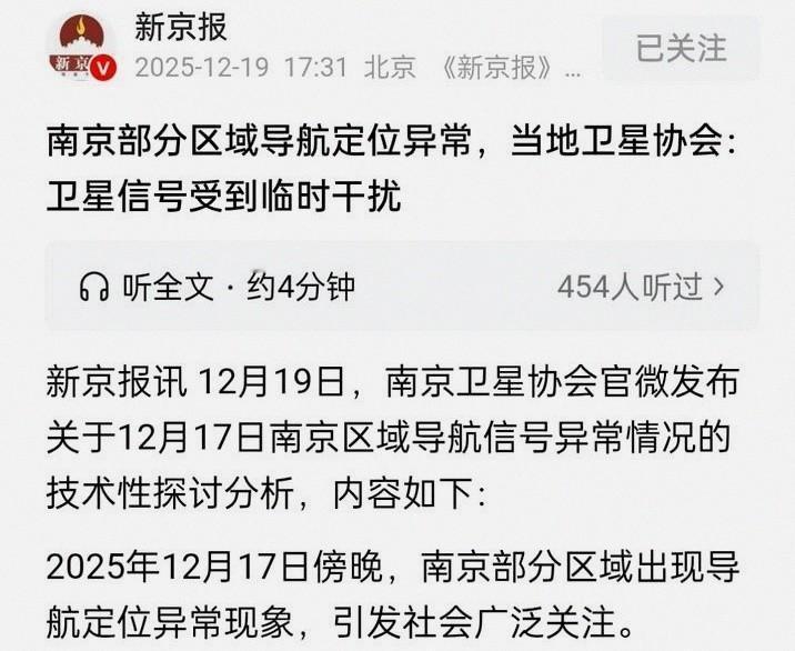12月17日,南京市导航受到干扰,这是一件面向未来战争的重要验证,通过对民用频率的干扰,导致定位漂移、无法定位。不仅是对北斗进行了干扰,同时也干扰了gps。充分验证了干扰的可行性。因为北斗的军用频率采用了加密技术,北斗军用频率不受影响。 一开始大家都以为是网络出了问题,不少老司机还习惯性地想下载离线地图解决,可试了之后才发现没用。 后来才知道,这次导航失灵根本不是简单的网络故障,而是一次针对性的导航信号干扰。 这事儿看着是影响了普通人的日常出行,实际上意义重大,算得上是一次面向未来战争的重要验证。 可能有人会好奇,导航怎么会说失灵就失灵? 其实我们手机导航靠的是卫星信号,比如北斗、GPS这些,得接收到至少四颗卫星的信号才能准确定位。 这次南京的情况,就是地面有强干扰源,把天上卫星发下来的民用频段信号给盖住了,手机接收不到有效信号,自然就没法精准定位,出现了各种漂移、无法定位的情况。 值得注意的是,这次干扰不只是针对我国的北斗系统,连美国的GPS也跟着受了影响。 一开始大家还疑惑是不是误伤,后来才明白,这恰恰验证了干扰的可行性。 原来北斗的民用信号和GPS的民用信号采用了兼容互操作的设计,就像两条缠绕在一起的藤蔓,想要干扰其中一个,另一个必然会被波及。 这次事件成功让两种导航系统的民用信号都出现问题,充分证明了这种干扰方式是切实可行的。 更关键的一点是,虽然民用导航信号乱成一团,但北斗的军用频率却完全没受影响。 这可不是偶然,而是因为北斗的军用频率采用了专门的加密技术,还配备了抗干扰和滤波功能,就像自带了“防护盾”一样,能把恶意的干扰信号过滤掉。 试想一下,现在不管是日常出行还是军事行动,都离不开导航。如果在战争中,能通过干扰敌方依赖的民用导航信号,让对方的交通、后勤乃至部分作战设备陷入混乱,就能占据主动。 而我方因为军用导航系统有足够的抗干扰能力,依然能保持精准定位和态势感知,这无疑是极大的优势。 12月17日南京的这次导航干扰事件,看似是一次普通的民生小插曲,实则是一次实打实的技术验证。它不仅证明了对民用导航频率进行干扰的可行性,更展示了我国北斗系统在军用领域的可靠性。 对于普通人来说,可能只是那天晚上多绕了点路、多等了一会儿,但背后蕴含的战略意义却不容忽视。