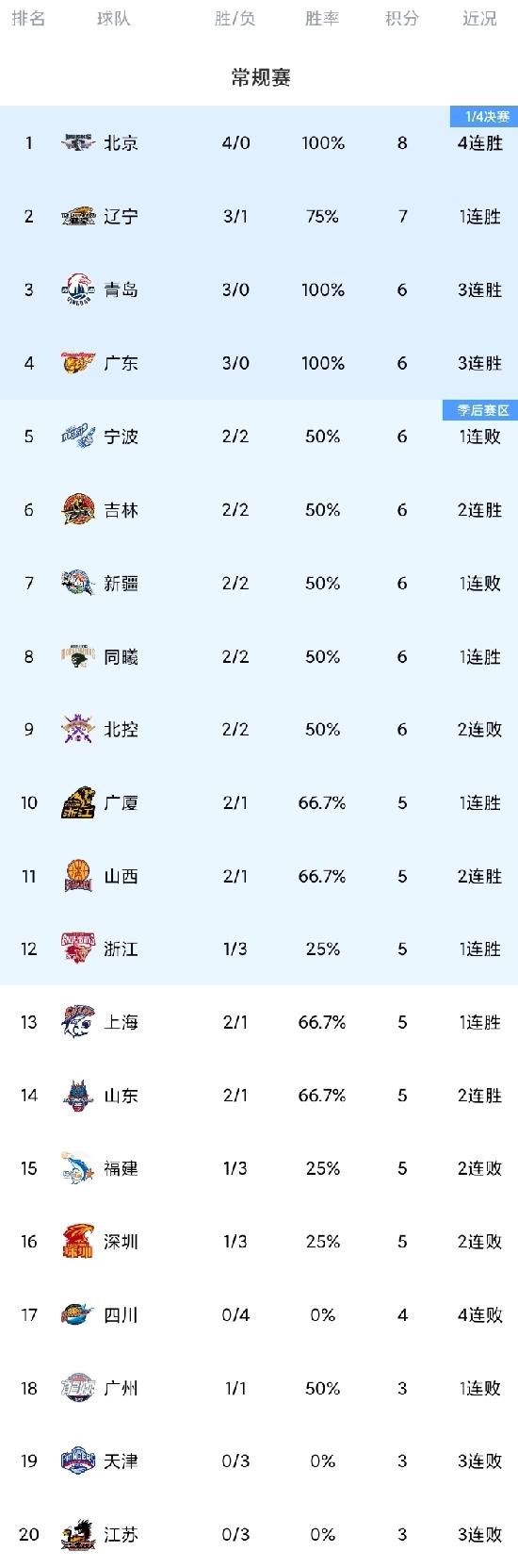 CBA最新积分榜!北京4连胜领跑,辽宁涉险过关,浙江队首胜,山东复仇北控。 北京104-88深圳!随着曾凡博的回归(未登场),北京队可谓全明星阵容,赵睿+陈盈骏+曾凡博+周琦,还有雷蒙、张才仁、范子铭、老将翟晓川与方硕。如此豪华阵容,北京队志在总冠军! 赛后,陈盈骏就表示:曾凡博的回归,提升了球队的士气。而陈盈骏自开赛季以来,状态爆棚,手感滚烫。本场对阵深圳队14投8中得到18分,赛季以来场均22.8分,投篮63.5%,三分61.9%,可谓准的离谱。 同曦84-53四川!四川队仍然是全联盟唯一一支没有外援的球队,成为待宰的羔羊,全队三分20投1中,惨败同曦31分的同时吃到4连败。对此个人认为,CBA有必要采取升降级制。 浙江89-79福建!浙江队凭借末节一波流击退福建队,终于拿下赛季开门红,全队6人得分上双。但是吴前状态低迷,8投1中还有6失误。不知道吴前是怎么了?记得园区比赛时,吴前时常打出耀眼的表现,但是如今下滑明显,国家队不见其身影,本赛季至今场均只有8.8分,三分命中率低至31.6%。 山东98-88北控!双方二番战,首次北控主场5分险胜。再次对阵,这回来到山东队主场,凭借首发强势的表现,山东队完成复仇。五人合计80分,其中四人得分上双,不过高诗岩只有4分。反观北控这边,沈梓捷的伤停还是对球队产生不小的影响。本场比赛,顶替沈梓捷的邹雨宸一分未得。 辽宁90-88宁波!宁波队差点掀翻联盟豪强辽宁队,不得不说宁波队有十足的进步。宁波队加入CBA大家庭以来,一直是“鱼腩的代表”,战绩垫底的存在。但是本赛季,有可能摆脱这一刻板印象。虽说辽宁队走了郭艾伦、张镇麟,赵继伟也受伤,但是瘦死的骆驼比马大,底蕴还在,宁波队在客场竟然把对手逼入绝境,放在以前不敢想象。 此外,新疆86-92吉林!近几个赛季,新疆队走了周琦,走了赵睿,阿不都沙拉木在刘炜麾下又不受重视,本赛季一直替补出战,场均9.8分钟。所以,球队看来是要重点培养齐麟,但是关键战比赛,齐麟没能站出来,仅7分。此外,西尔扎提21分,但是最后时刻连续犯错,强攻被帽,走步,发球被断,最终新疆6分不敌吉林。 CBA最新积分榜,如下图。北京4胜0负,全胜领跑。辽宁位居次席。宁波第5。新疆第7。北控第9。山东第14。四川0胜4负第17。