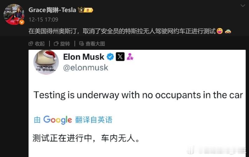 特斯拉公司副陶琳通过社交媒体确认,在美国得州奥斯汀,取消安全员的特斯拉无人驾驶网约车正在进行实际道路测试意味着特斯拉的FSD(完全自动驾驶)系统已具备在真实城市交通环境中完全自主决策的能力大v聊车