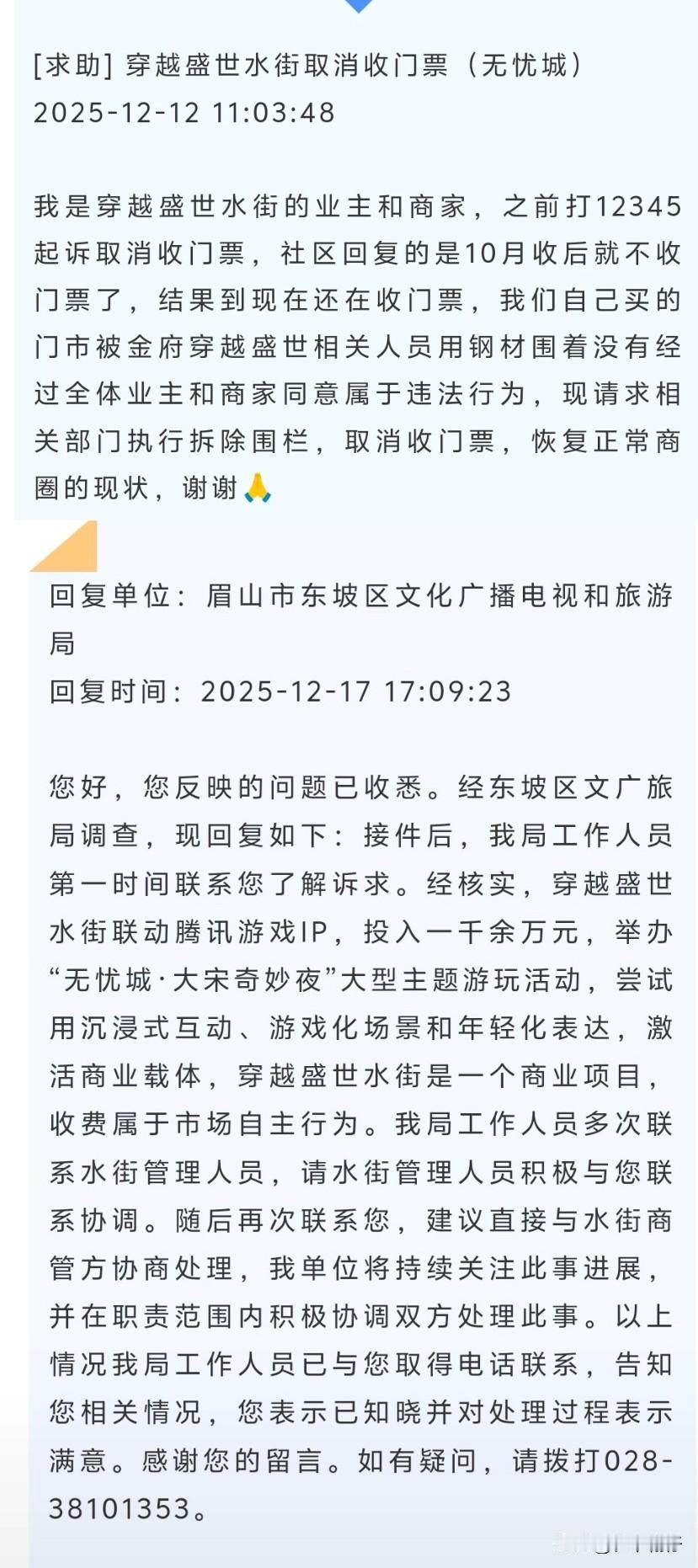 最近有眉山穿越盛世水街的业主和商家,12月12日在问政四川上留言希望穿越盛世水街取消收门票(无忧城),留言称自己买的门市被金府穿越盛世相关人员用钢材围着,没有经过全体业主和商家同意属于违法行为,现请求相关部门执行拆除围栏,取消收门票,恢复正常商圈的现状。 眉山市东坡区文化广播电视和旅游局12月17日回复;穿越盛世水街联动腾讯游戏IP,投入一千余万元,举办“无忧城·大宋奇妙夜”大型主题游玩活动,穿越盛世水街是一个商业项目,收费属于市场自主行为。建议直接与水街商管方协商处理。 这已不是穿越盛世水街首次因收费问题引发争议。今年国庆期间,该项目就曾因首次尝试封闭式售票运营而受到关注。 作为眉山市的文旅新地标,水街原本由“东坡印象水街”、“穿越城”和“东坡里”三个街区组成。此前,这些街区均免费开放,吸引大量游客和本地居民。 今年国庆期间,运营方首次尝试封闭式售票运营,但实际收费范围仅限于举办“无忧城·大宋奇妙夜”沉浸式活动的“穿越城”街区。 面对人流锐减、商家退场等挑战,运营方选择通过与腾讯合作,打造NPC互动、3D投影、非遗彩灯等场景,试图以“内容升级+客流筛选”的方式突破困境。“无忧城·大宋奇妙夜”作为一项投入一千余万元的大型主题活动,有其特定的运营周期和成本回收需求。 这个项目不归文旅管辖,是个私人项目,穿越盛世水街是属于开发企业的,收费也是他们企业行为。这条求助留言迅速引起广泛关注。在问政四川平台上被标记为“已办结”,但问题远未得到实质性解决。
