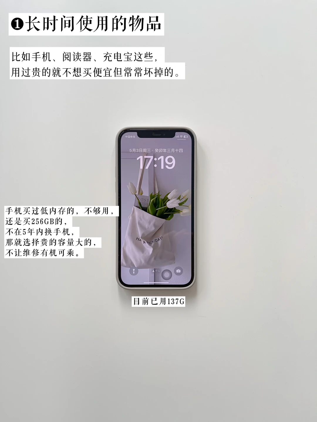 比如手机、阅读器、充电宝这些,用过贵的就不想买便宜但常常坏掉的。电子产品我经常给大家看到也是这几样,精简但耐用,比如手机买过低内存的,不够用,还是买256GB的,不在5年内换手机,那就选择贵的容量大的,不让维修有机可乘。