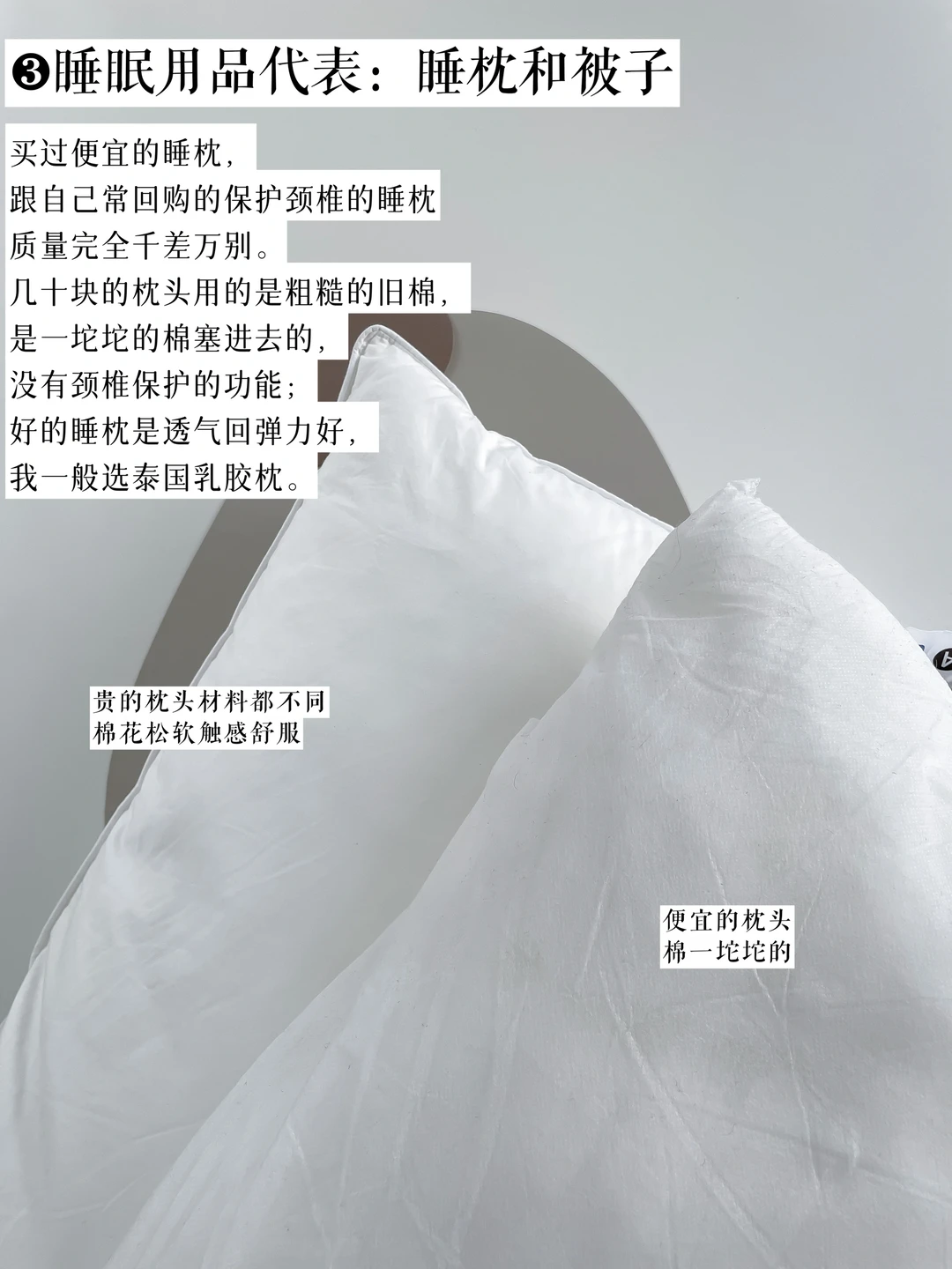 买过便宜的睡枕,跟自己常回购的保护颈椎的睡枕质量完全千差万别。几十块的枕头用的是粗糙的旧棉,是一坨坨的棉塞进去的,没有颈椎保护的功能;好的睡枕是透气回弹力好,泰国乳胶枕。虽然买的时候觉得“有必要买贵吗?”但试过以后睡枕真的要买好买贵些。被子也同理,材质不同触感也不同,买过平替跟正价都不一样。做个理智的消费者,睡眠物品上我要高品质。