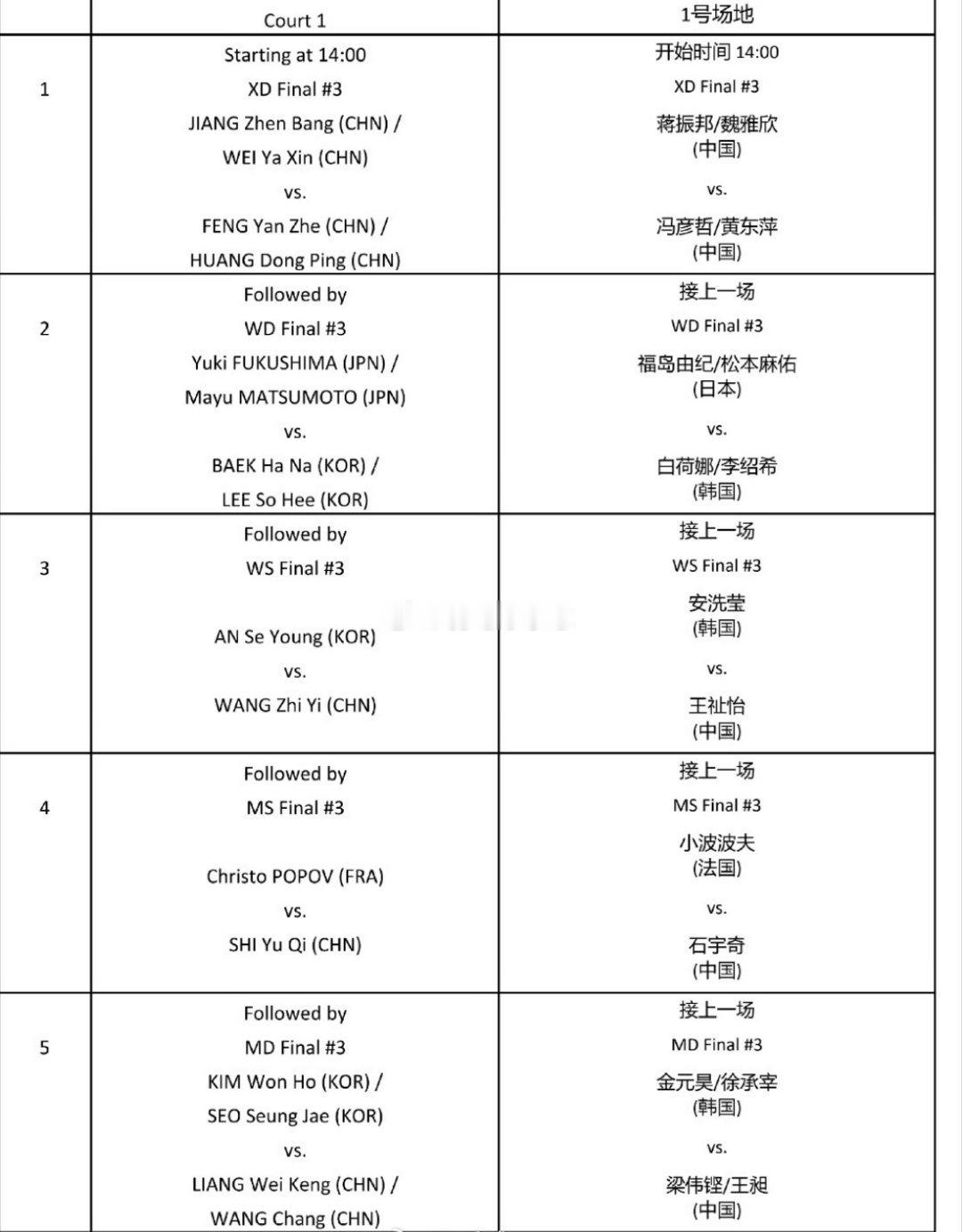 决赛赛程安排:混双-女双-女单-男单-男双国羽总决赛四项进决赛2025年世界羽联年终总决赛