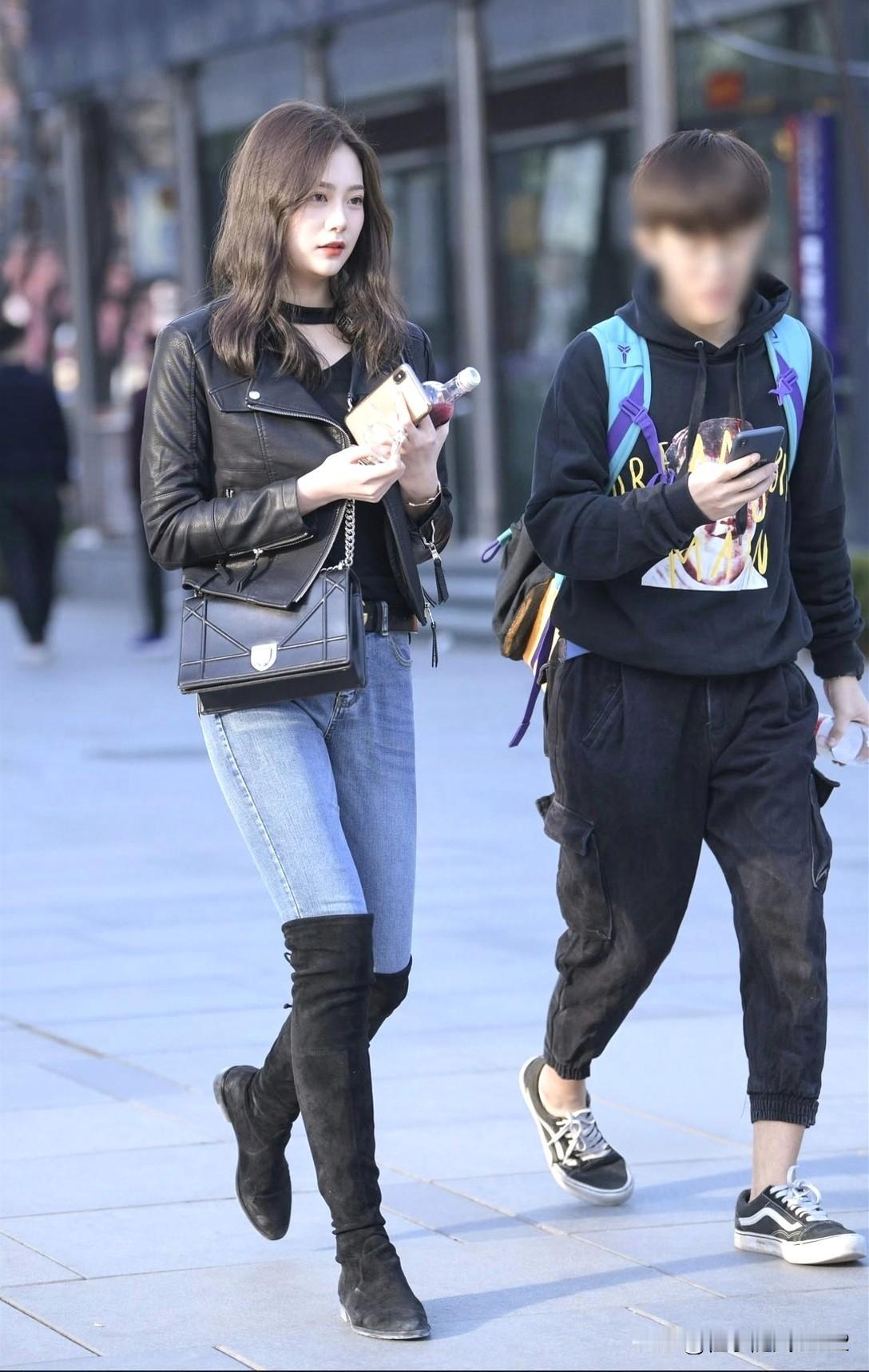 都市街头时尚:皮夹克+牛仔裤+高筒靴,青春与酷感并存
