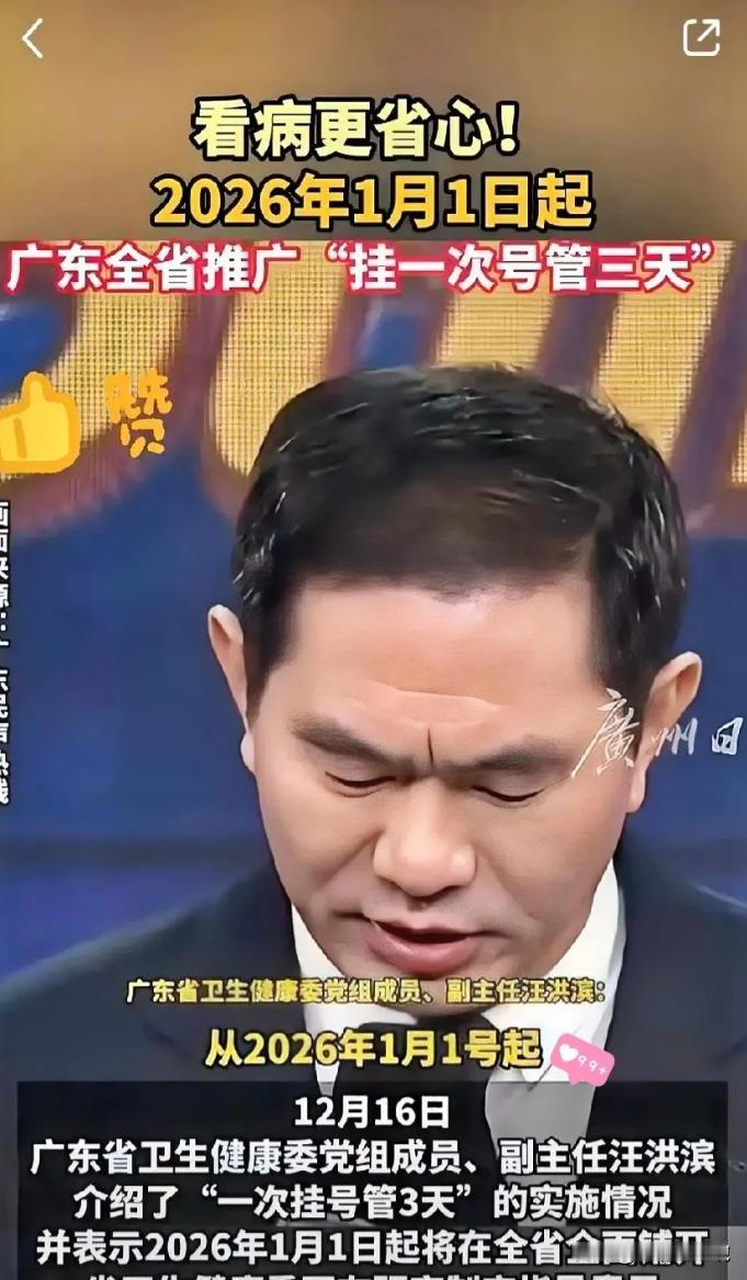 这下全国都要眼红广东人了! 刚刷到的消息,据广东卫健委相关通知:从2026年1月1号开始,广东全面推行“一次挂号管三天”政策——针对检查结果未出、未完成诊疗的情况,三天内续诊不用重复挂号,直接省下排队时间和挂号费。 说白了,广东这波“一次挂号管三天”操作,就是把患者看病时最折腾的“二次挂号”坑给填上了,让就医少点糟心事、多些暖心事。 说真的,广东这政策一出来,估计不少有过糟心就医经历的人都要羡慕哭了。 谁没在医院遭过“挂号难、反复跑”的罪啊?本来身体就不舒服,一进医院更是晕头转向,医生问诊几分钟开一堆检查单,新手患者光搞懂各个检查科室在哪就得费半天劲,更别说有些检查还得预约,当天根本做不上。 就算赶巧当天做完了检查,报告出来往往都得等几个小时,碰上医生下班,拿着报告单只能干着急,第二天还得再来一趟。 最让人闹心的是,再来的时候还得重新挂号,不管是普通号的十几二十块,还是专家号的几十上百块,都是额外开销,更别说排队挂号又得耗上大半天,上班族还得专门再请一天假,时间、金钱、精力全搭进去了。 广东这次推出的政策,恰恰就精准解决了这个痛点,满是公共服务该有的温度,它不是什么空洞的口号,而是真真切切站在患者的角度,从就医流程的细节里找问题、做优化。 要知道,之前有调研数据显示,三级医院里六成多的门诊患者都得因为检查二次返院,其中八成以上都觉得重新挂号增加了负担。 尤其是那些异地就医的人,为了等检查结果得在陌生城市多待几天,住宿、交通加上重复挂号费,就医成本直线上升。 现在有了“一次挂号管三天”,只要是同一家医院的原接诊医生,三天内拿着检查结果去续诊都不用再挂号,不仅省了钱,更省了反复排队、抢号的功夫,让“看诊-检查-复诊”的流程顺顺畅畅走下来。 这背后其实是医改思维的重要转变,不再纠结于宏大的政策叙事,而是聚焦到患者就医时具体而微的“不适感”上。 以前提到医改,大家可能会想到医保报销、医院评级这些大方向,而这次的政策却关注到了“续诊再挂号”这个小细节,但就是这个小细节,却直接影响着每个人的就医体验。 它让医疗服务回归到了“以患者为中心”的本质,不再让患者围着流程转,而是让流程适配患者的需求。 不过要让这个好政策真正落地见效,后续的精细化管理可得跟上,比如得明确哪些情况属于“未完成诊疗”,不同科室之间的信息要打通,避免患者拿着检查结果换个科室还得重新挂号。 医院的挂号系统也得升级优化,把首诊和续诊患者的号源合理分配,避免出现续诊患者排不上队的情况;还有医护人员的工作量核算和绩效激励也得跟上,毕竟续诊患者多了,医生的工作量会增加,只有让医护人员的付出得到合理认可,他们才能更有动力做好服务。 目前广东一些医院已经在提前准备了,比如医生开检查单时就自动预约好48小时内的检查,保证患者能在三天有效期内完成复诊,这些细节都做得很到位。 文章仅代表个人看法,不知道大家有没有过类似的就医困扰?你觉得广东这个“一次挂号管三天”政策怎么样?欢迎在评论区聊聊你的看法。