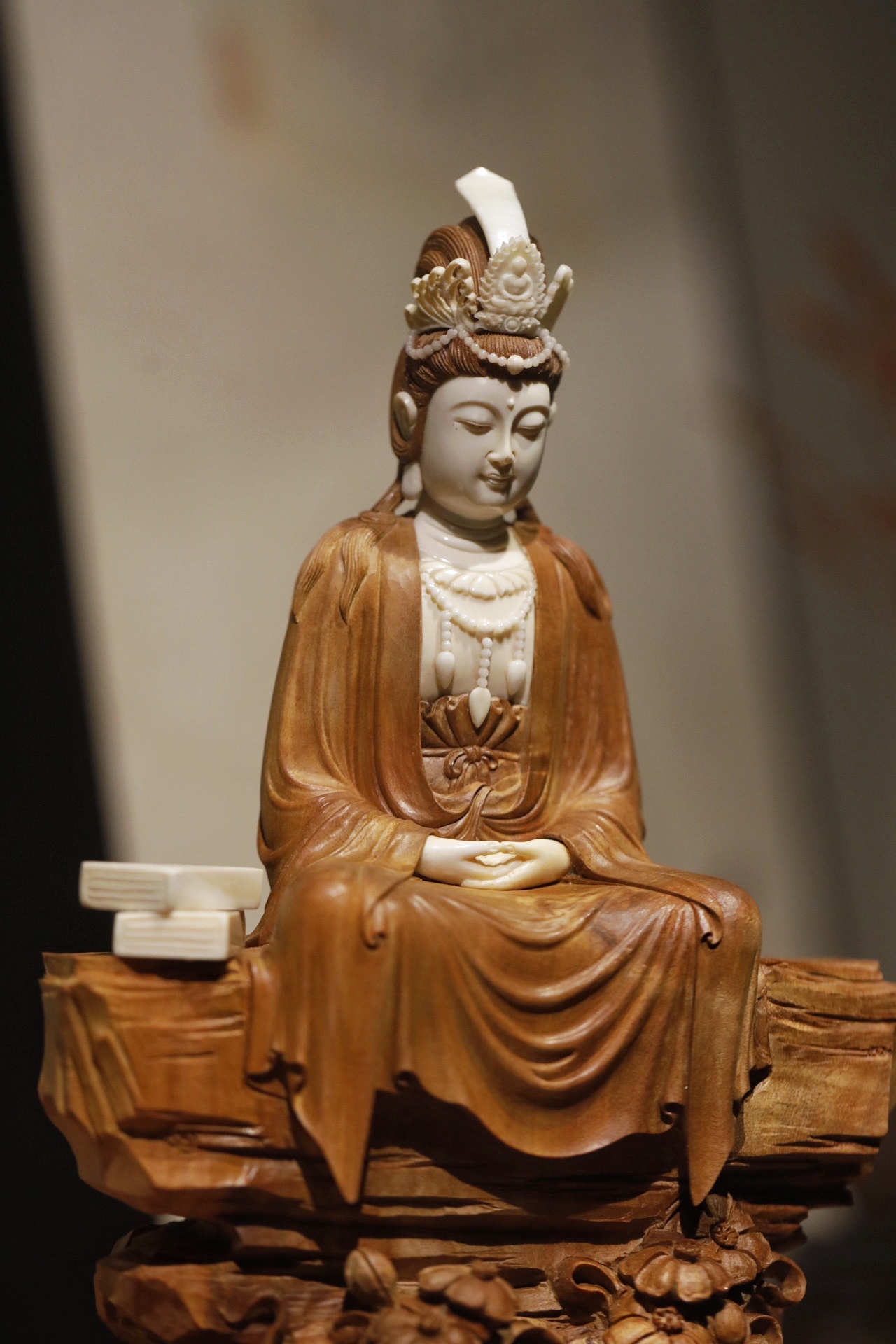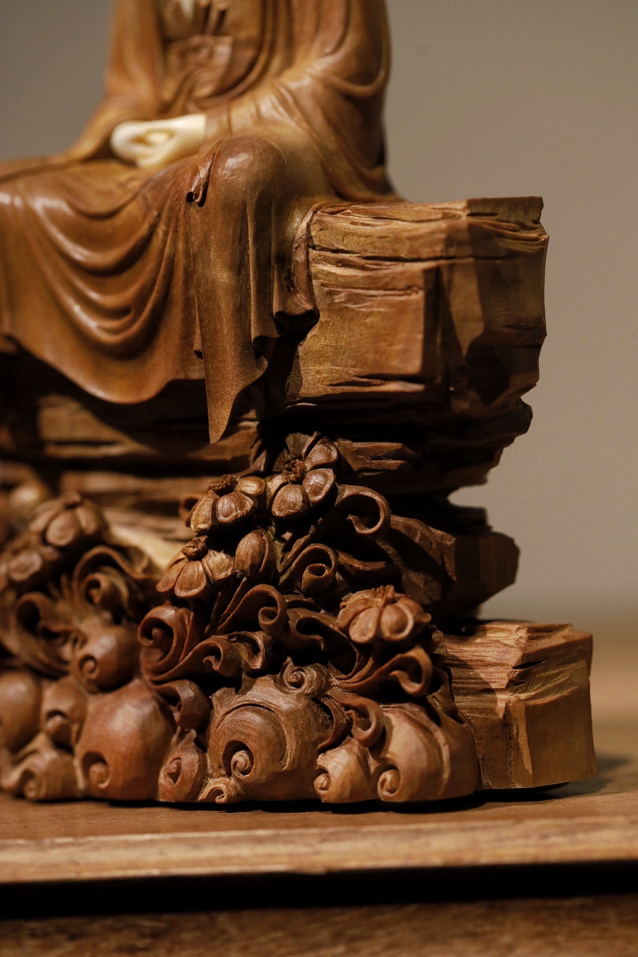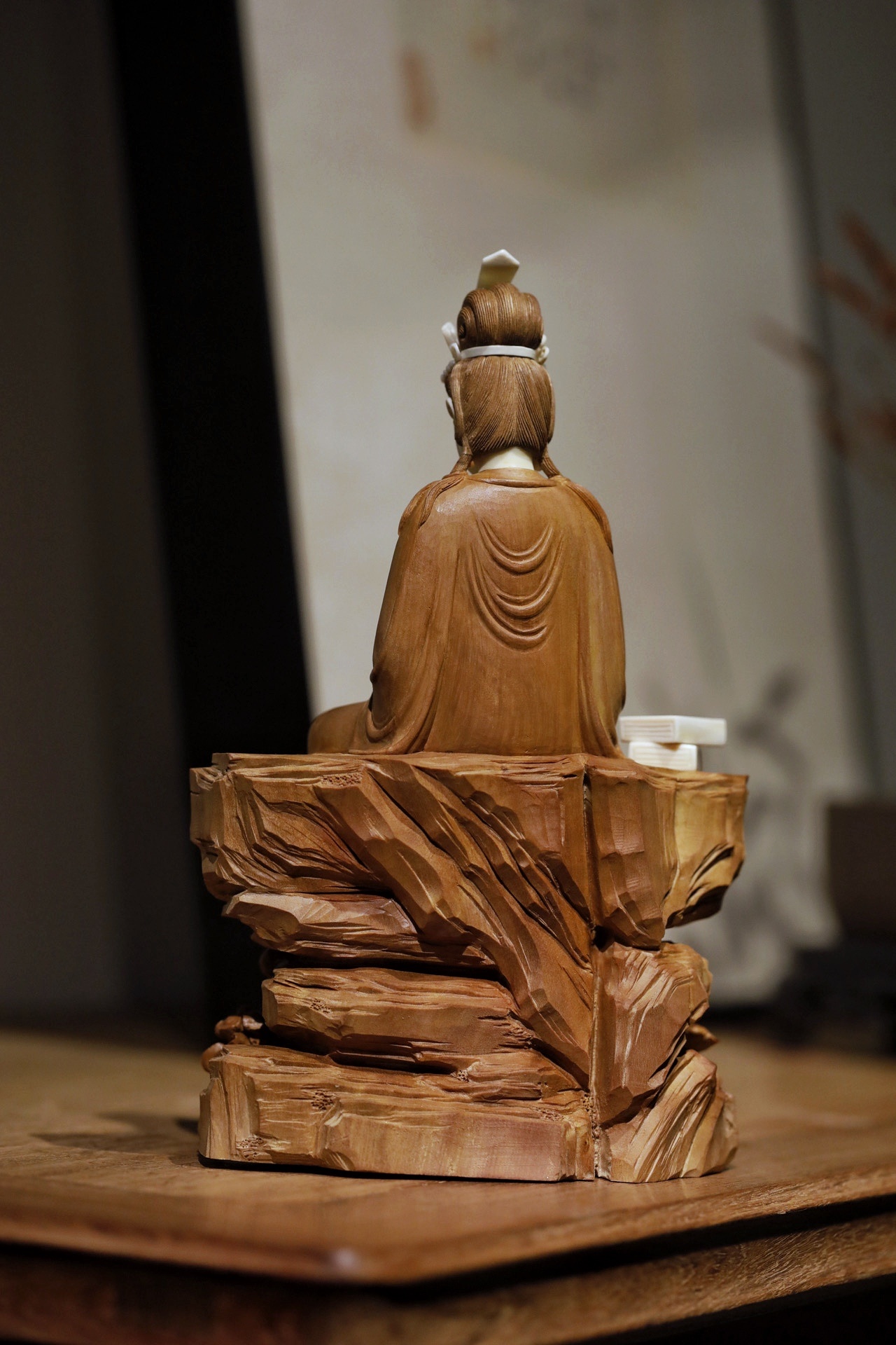 老山檀香×猛犸|圣观音色泽沉润雅致,观音面容饱满莹洁,双目微闭,尽显禅定悠然之态,宝衣褶皱雕凿层叠,轻柔曼妙如流云,整尊造像庄严肃穆,藏纳清净祥和之意。13.5×8×22cm重量582g