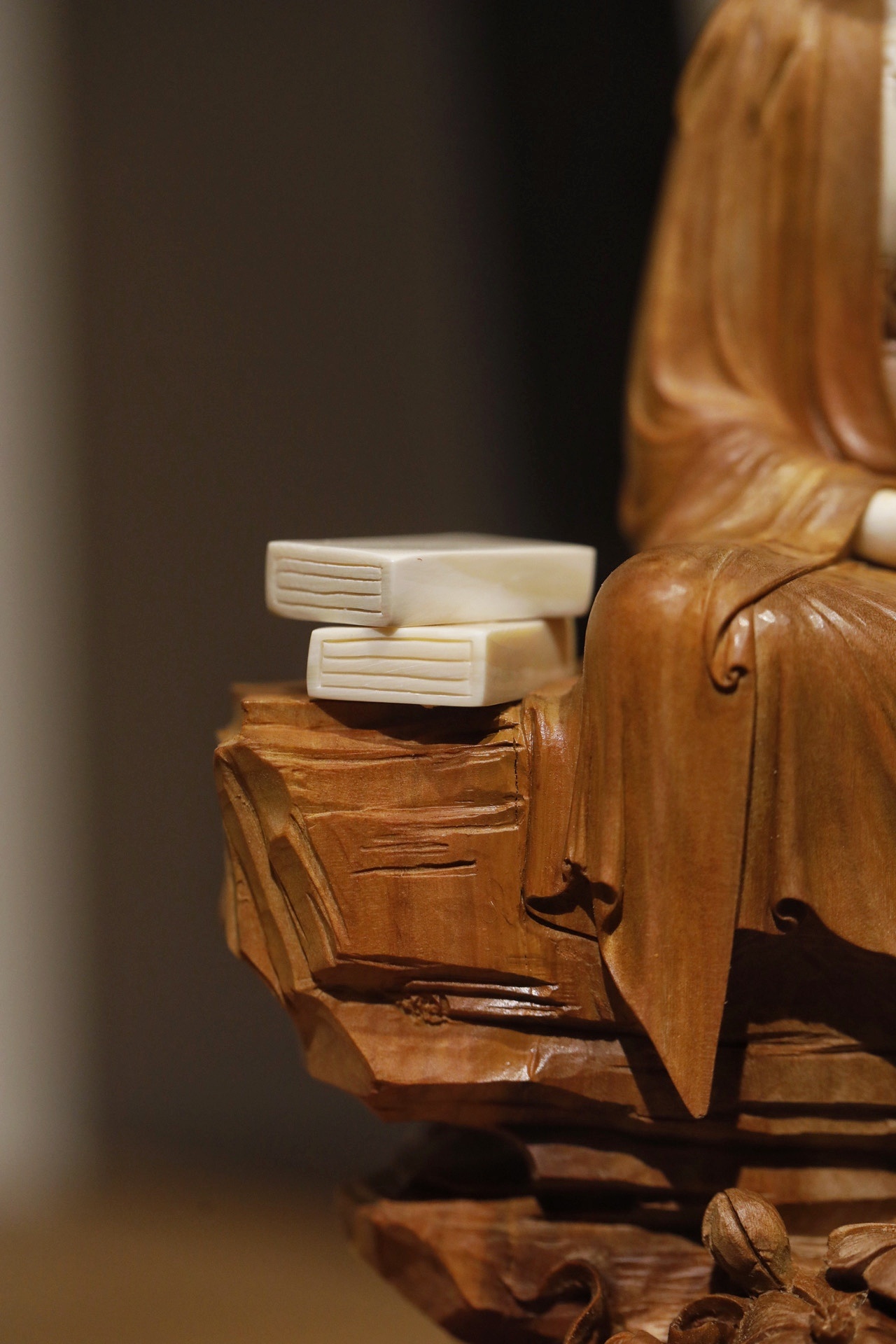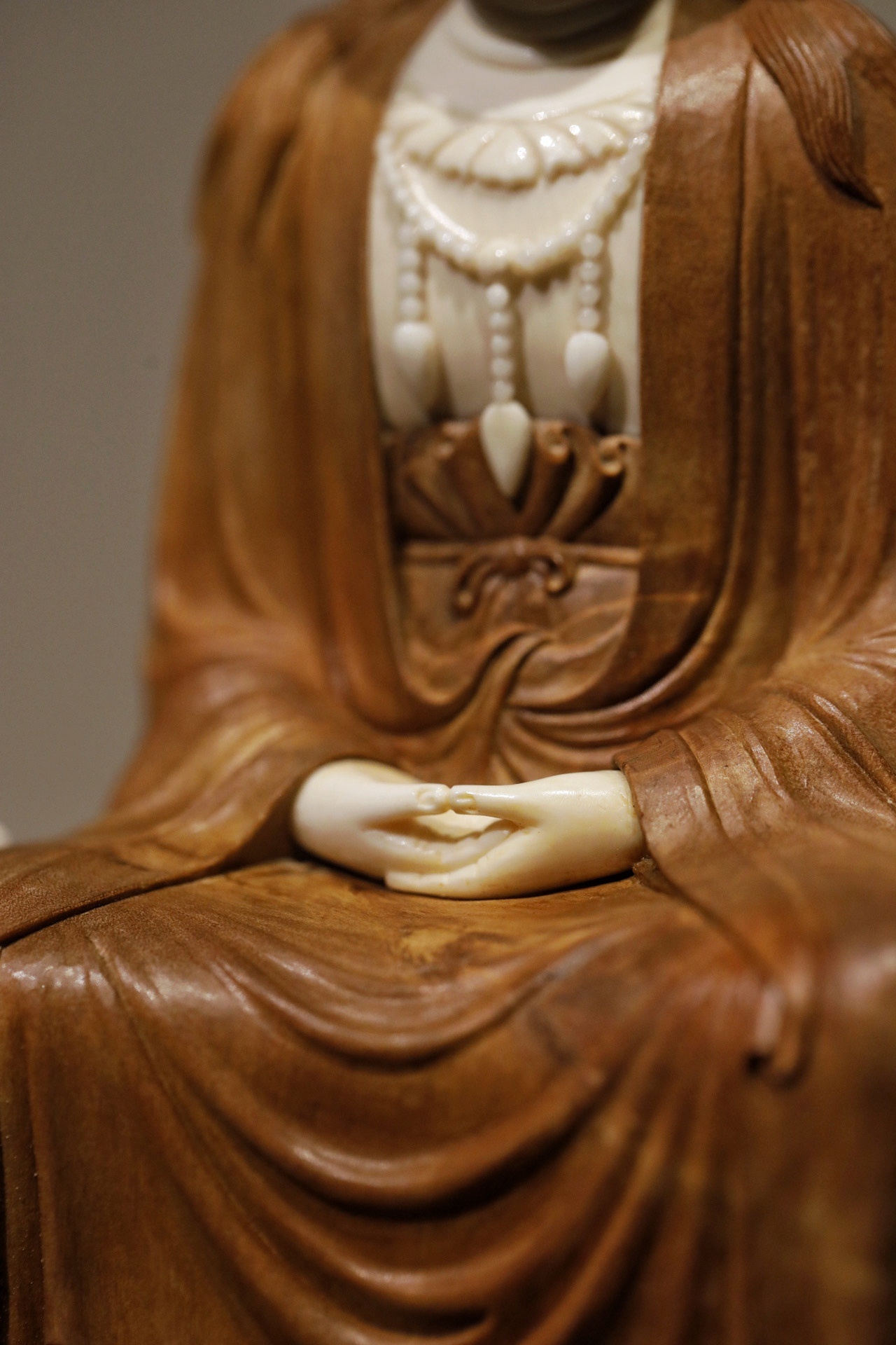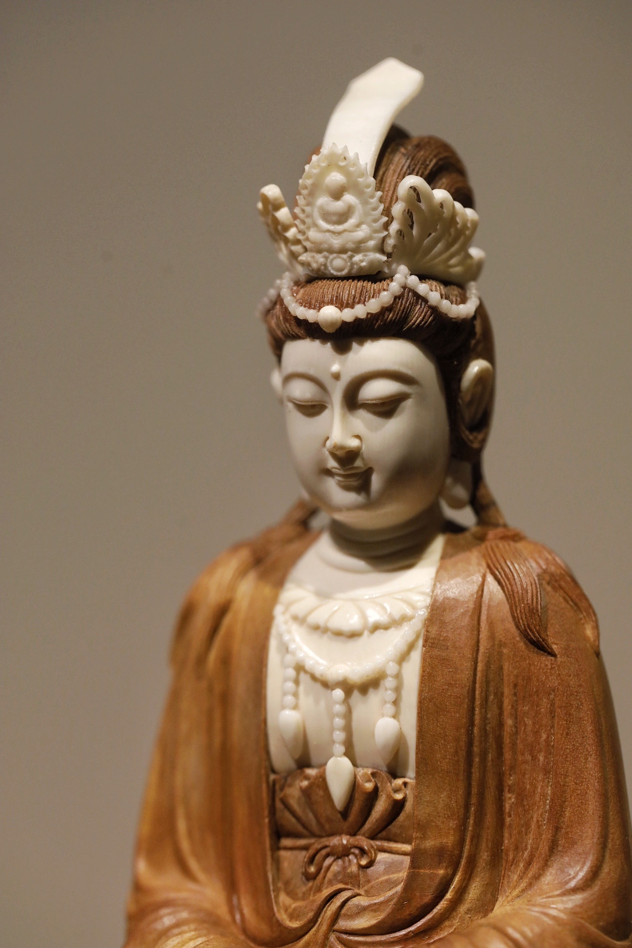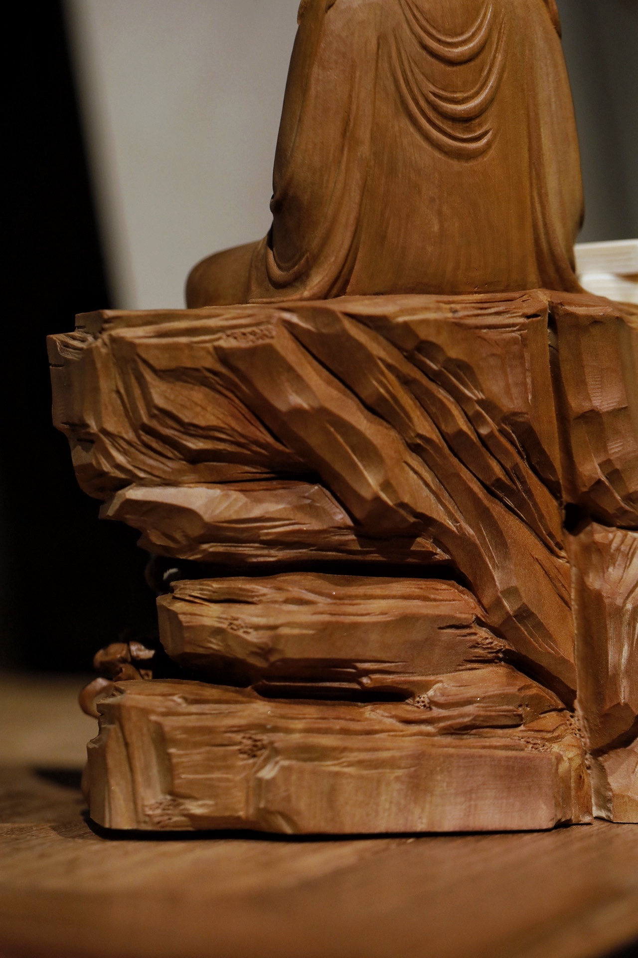 老山檀香×猛犸|圣观音色泽沉润雅致,观音面容饱满莹洁,双目微闭,尽显禅定悠然之态,宝衣褶皱雕凿层叠,轻柔曼妙如流云,整尊造像庄严肃穆,藏纳清净祥和之意。13.5×8×22cm重量582g
