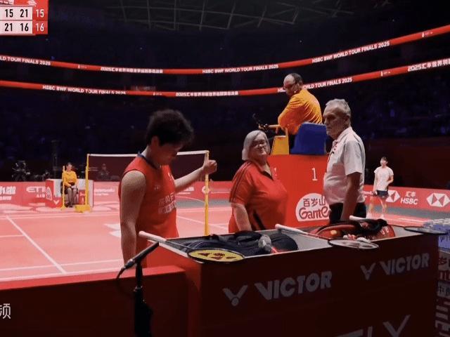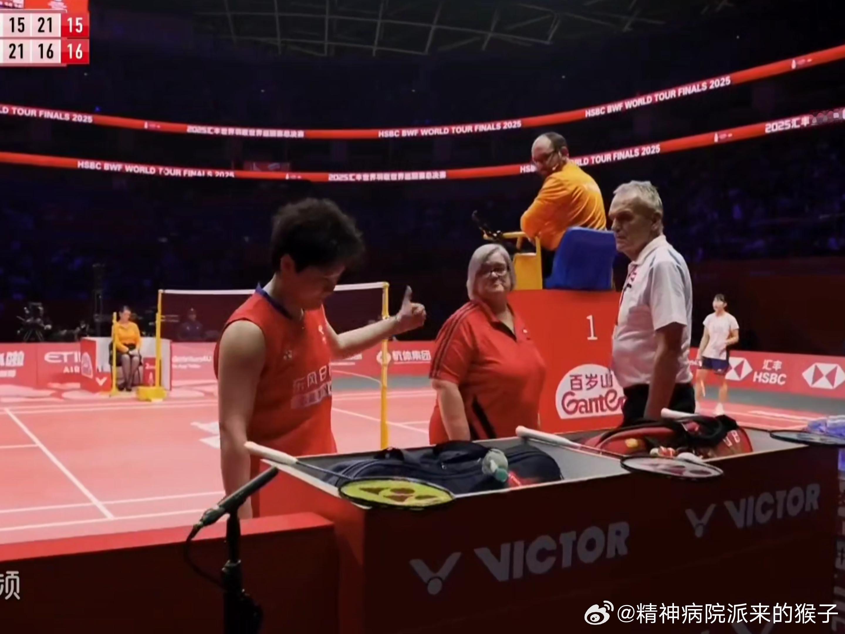 2025年世界羽联年终总决赛 谭宁打了一个长多拍之后觉得手肘可能有些问题,叫了个医疗暂停,裁判上来看了一眼之后,表示不能提供医疗帮助😅小谭宁无语的给裁判点了个赞,后边主裁又因为拖延给皮皮发了张黄牌