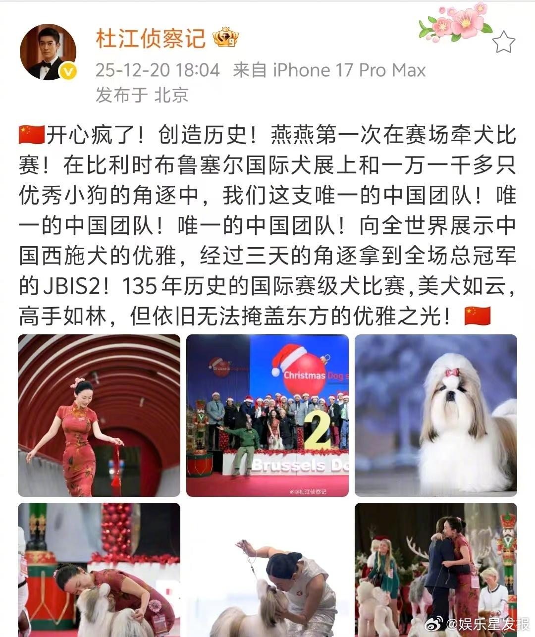 霍思燕爱犬在国际比赛夺冠 霍思燕身着旗袍带领自己的西施爱犬参加了第135届比利时布鲁塞尔国际犬展,该比赛是FCI(世界犬业协会)认证的拥有135年历史的欧洲赛级犬比赛。其带领的“西施犬”是中国原生犬,率先获得该品类冠军,而后在该次国际比赛的11020只赛犬中脱颖而出,荣获全场总冠军JBIS2。