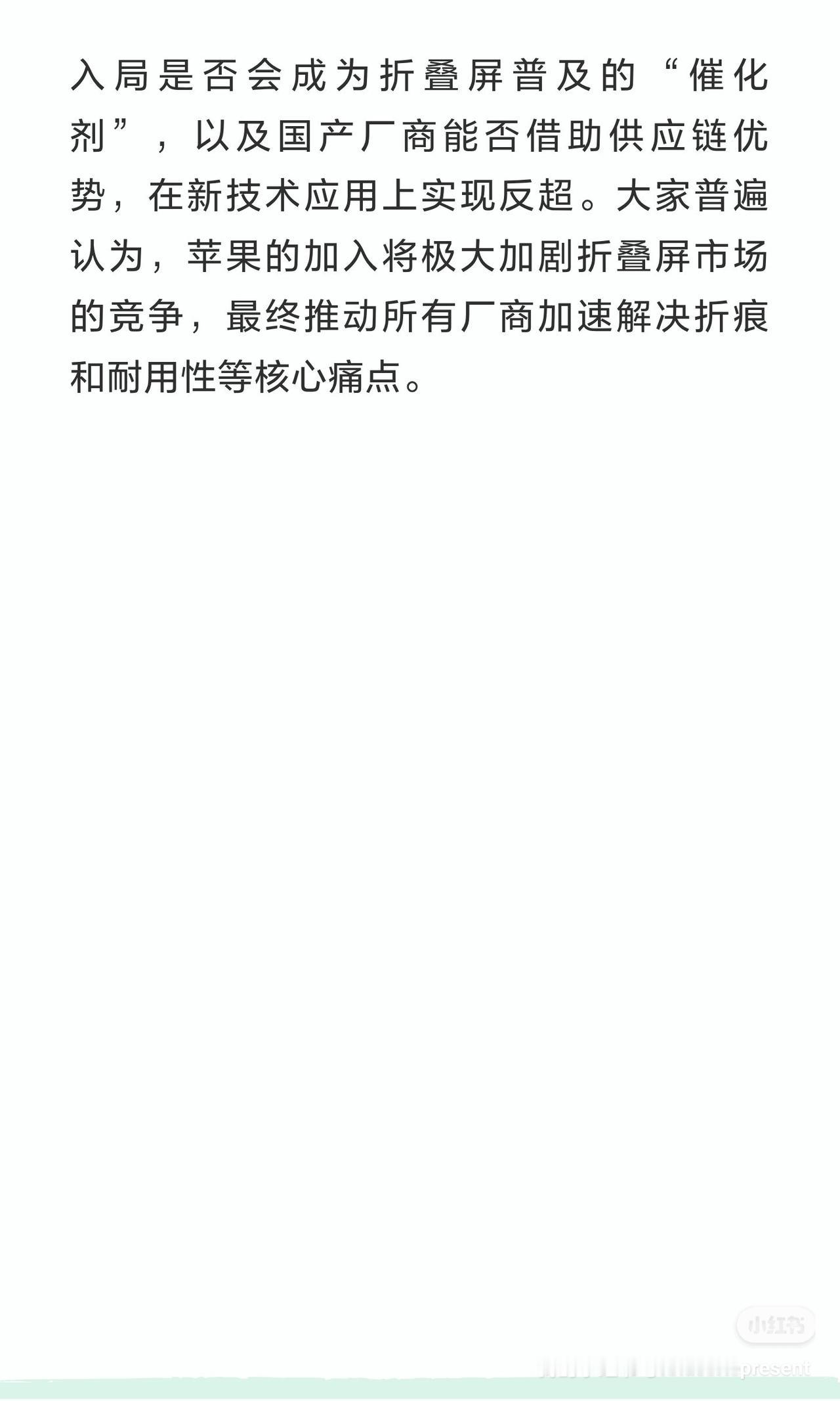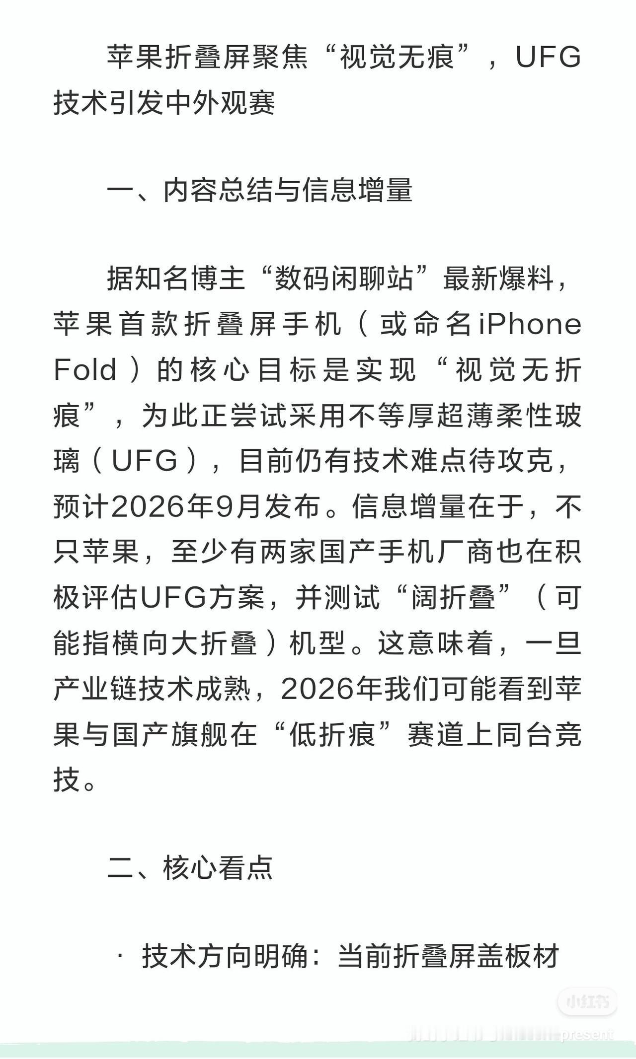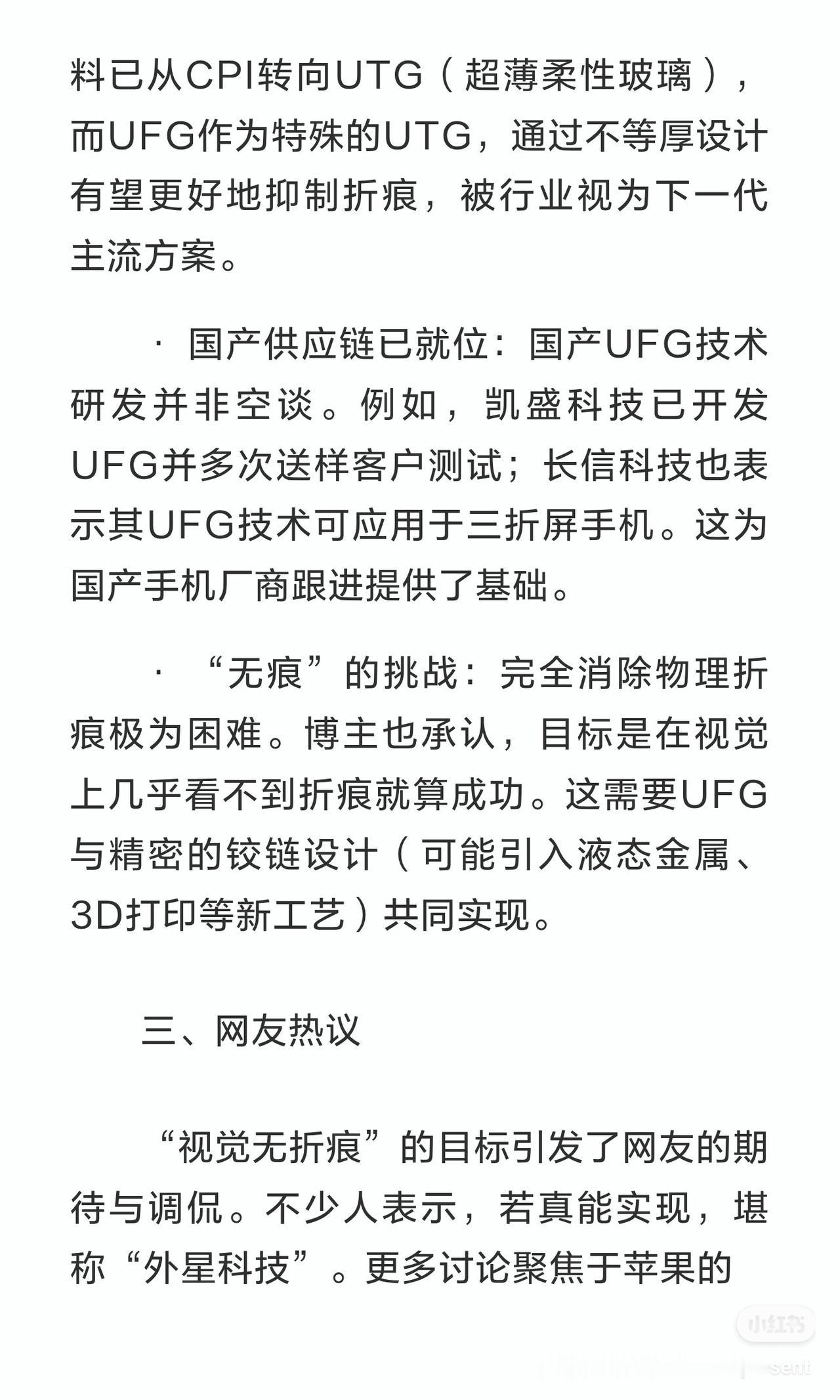 苹果折叠屏聚焦“视觉无痕”,UFG技术引发中外观赛 一、内容总结与信息增量 据知名博主“数码闲聊站”最新爆料,苹果首款折叠屏手机(或命名iPhone Fold)的核心目标是实现“视觉无折痕”,为此正尝试采用不等厚超薄柔性玻璃(UFG),目前仍有技术难点待攻克,预计2026年9月发布。信息增量在于,不只苹果,至少有两家国产手机厂商也在积极评估UFG方案,并测试“阔折叠”(可能指横向大折叠)机型。这意味着,一旦产业链技术成熟,2026年我们可能看到苹果与国产旗舰在“低折痕”赛道上同台竞技。 二、核心看点 · 技术方向明确:当前折叠屏盖板材料已从CPI转向UTG(超薄柔性玻璃),而UFG作为特殊的UTG,通过不等厚设计有望更好地抑制折痕,被行业视为下一代主流方案。 · 国产供应链已就位:国产UFG技术研发并非空谈。例如,凯盛科技已开发UFG并多次送样客户测试;长信科技也表示其UFG技术可应用于三折屏手机。这为国产手机厂商跟进提供了基础。 · “无痕”的挑战:完全消除物理折痕极为困难。博主也承认,目标是在视觉上几乎看不到折痕就算成功。这需要UFG与精密的铰链设计(可能引入液态金属、3D打印等新工艺)共同实现。 三、网友热议 “视觉无折痕”的目标引发了网友的期待与调侃。不少人表示,若真能实现,堪称“外星科技”。更多讨论聚焦于苹果的入局是否会成为折叠屏普及的“催化剂”,以及国产厂商能否借助供应链优势,在新技术应用上实现反超。大家普遍认为,苹果的加入将极大加剧折叠屏市场的竞争,最终推动所有厂商加速解决折痕和耐用性等核心痛点。