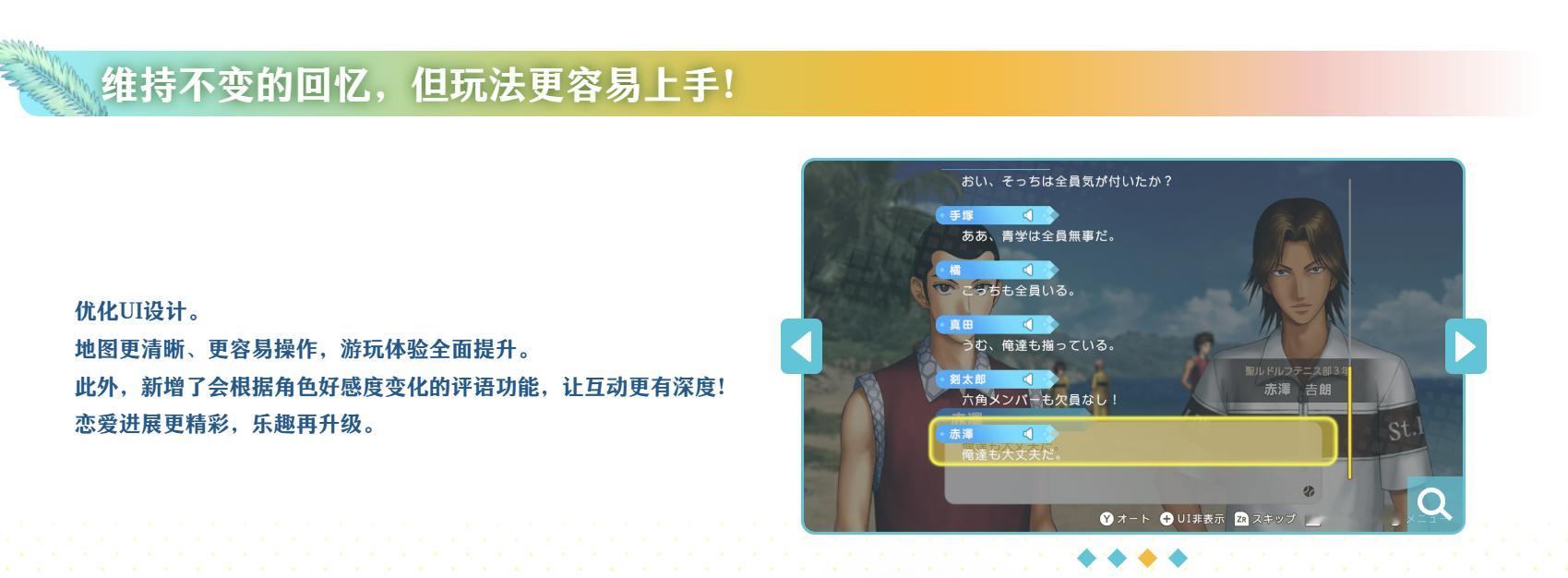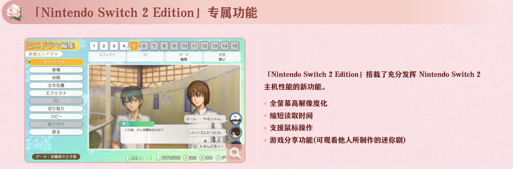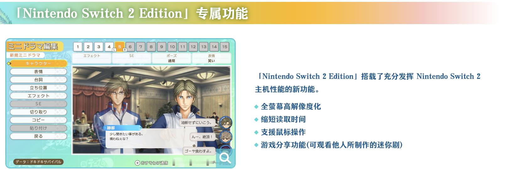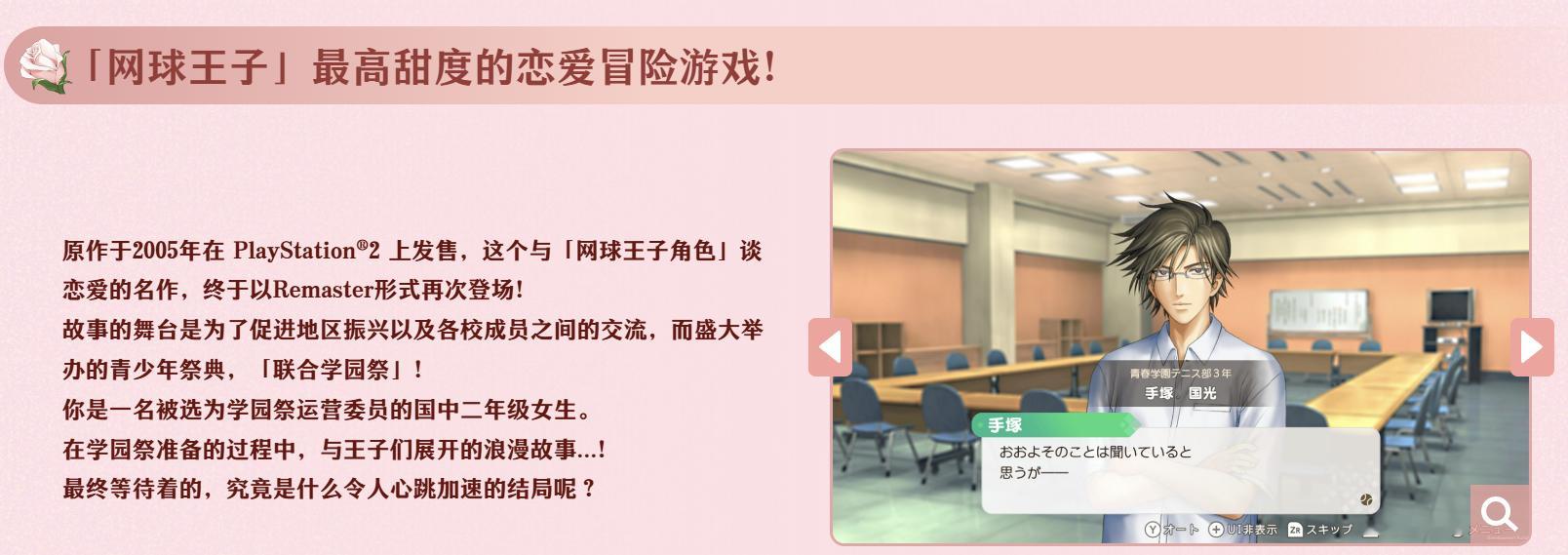 【《网球王子》经典游戏重制版Switch 2专属功能公布】科乐美旗下的《网球王子:学园祭的王子》和《网球王子:心跳求生》的两款游戏重制版中文网站现已上线,游戏将登陆Switch、Switch 2、Steam平台,发售日期暂未公布。在中文网站中,游戏公布了Switch 2的专属功能:全屏幕高解析度化,缩短读取时间,支持鼠标操作,游戏分享功能(可观看他人所制作的迷你剧)。游戏的重制版全新绘制的插图采用高精细图像,部分插图进行了重制,以更精美的画风让你更加心动! 同时搭载新旧插图切换功能(仅限部份插图)。优化UI设计。地图更清晰、更容易操作,游玩体验全面提升。此外,新增了会根据角色好感度变化的评语功能,让互动更有深度,此外《网球王子》Switch 2版仅提供数码版,没有实体版。两款游戏的原版分别在2005年和2006年于PS2上推出,是基于《网球王子》漫画的恋爱冒险游戏。