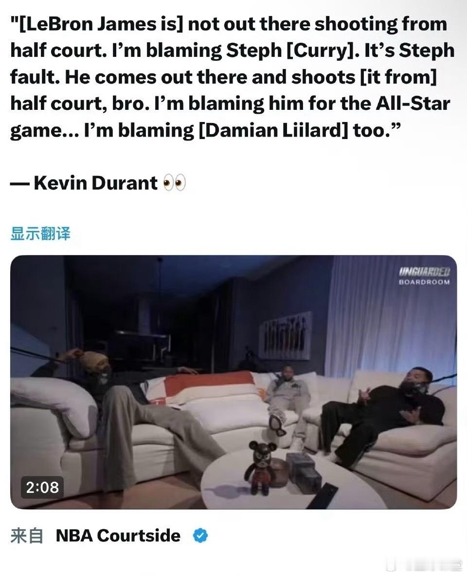 杜兰特把全明星赛越来越难看的责任归咎于利拉德和库里!“勒布朗全明星赛上每次都表现很出色”