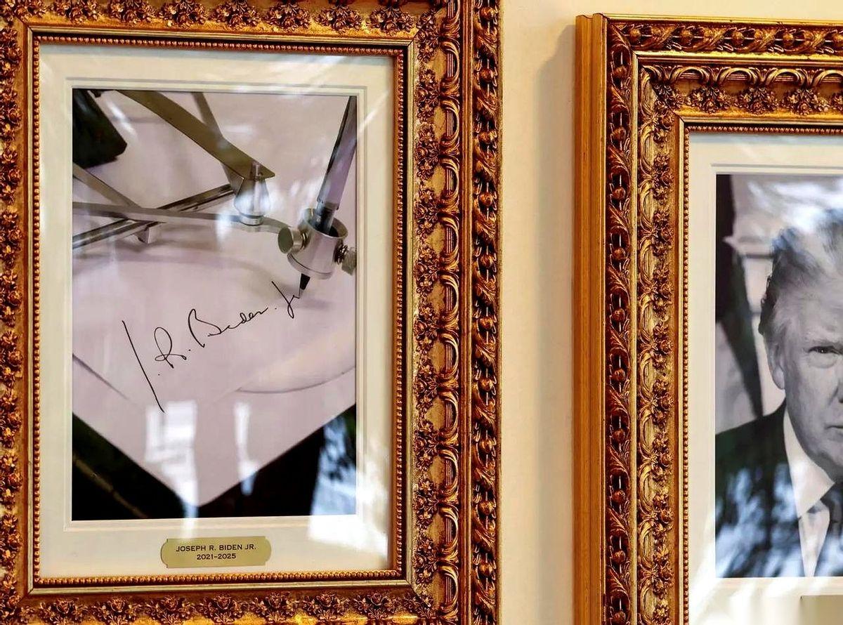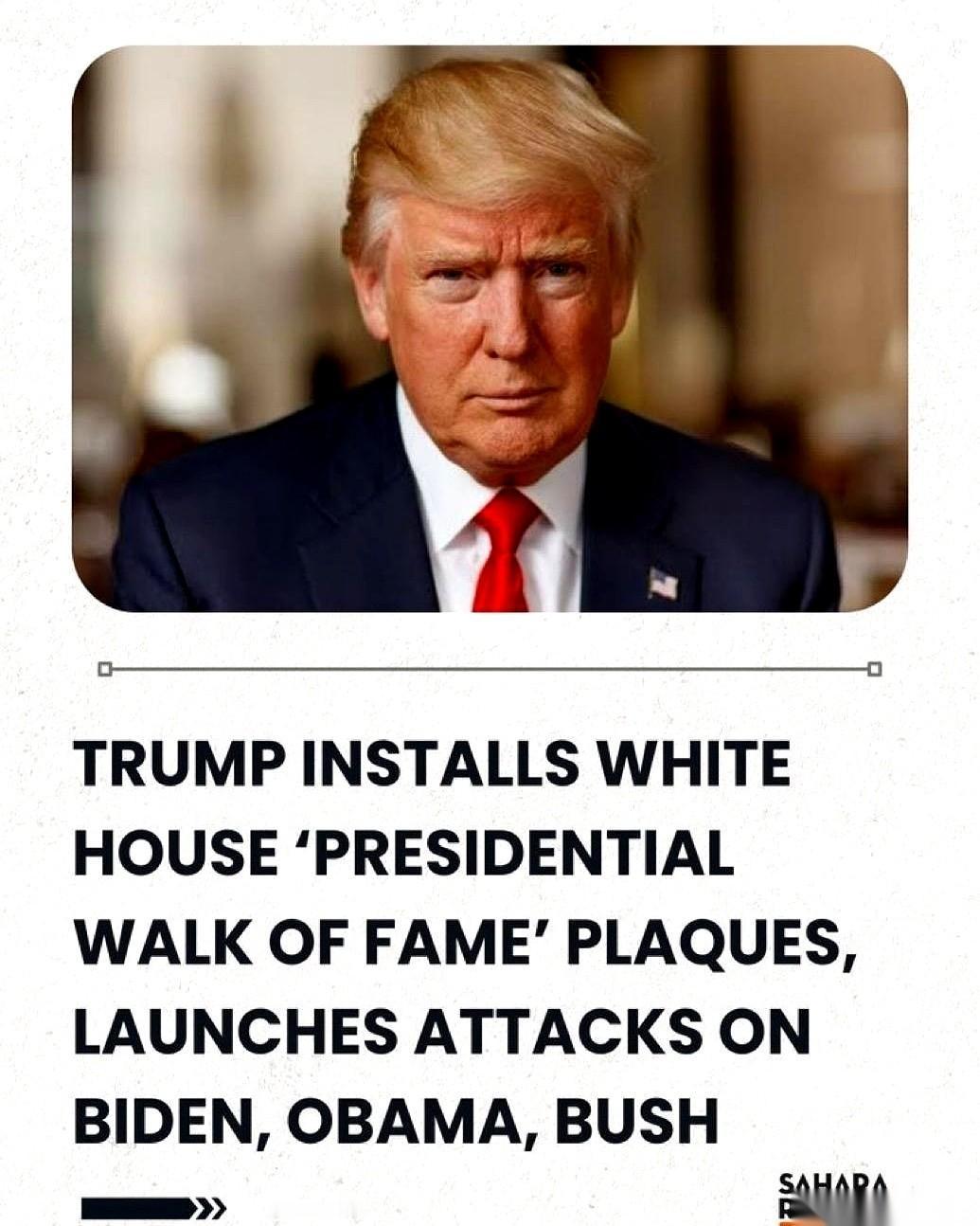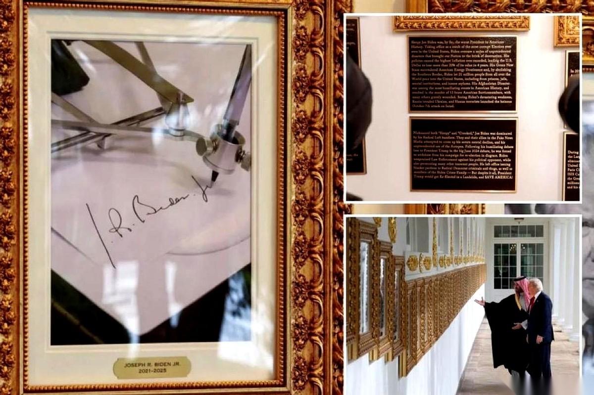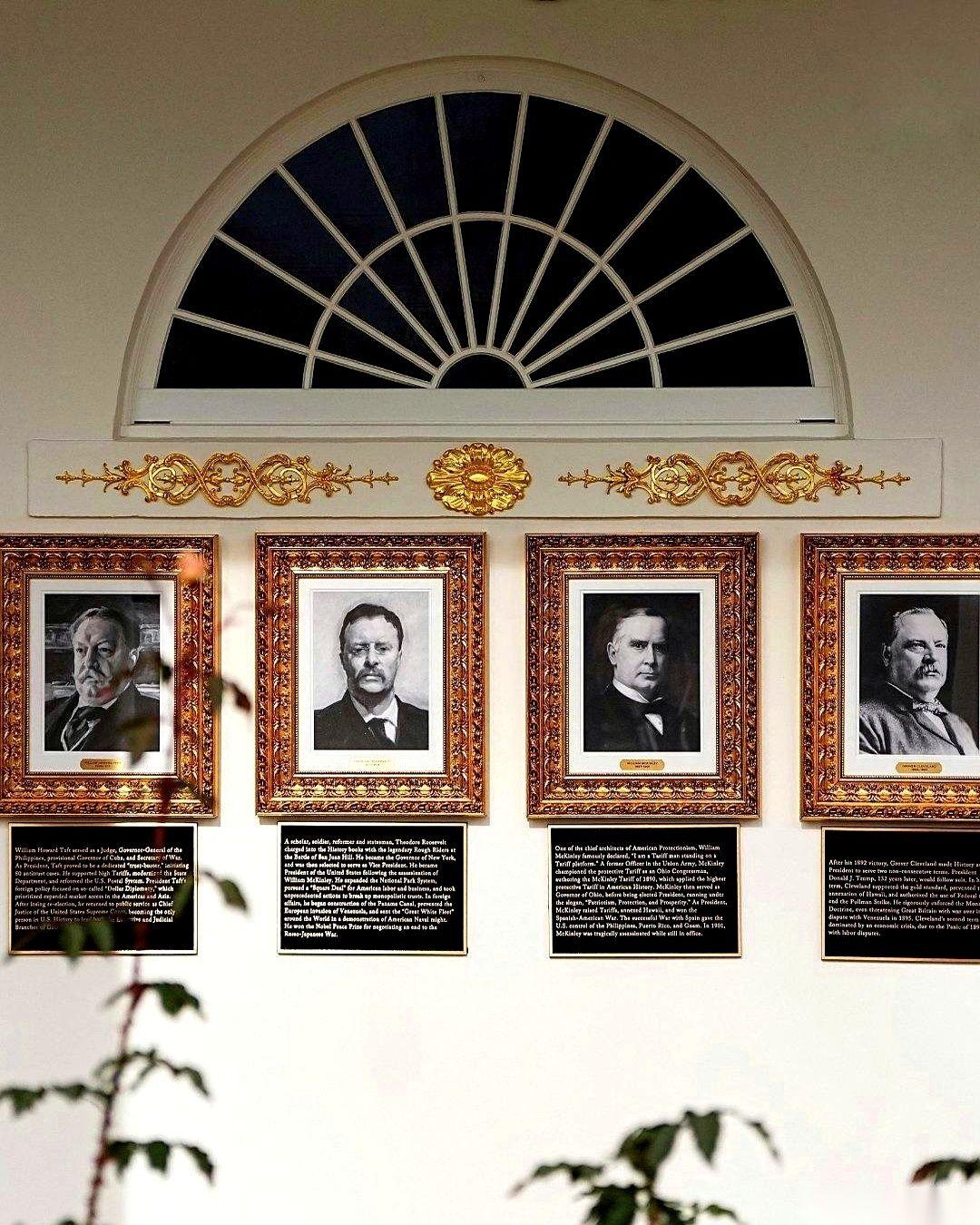 拜登的总统画像,直接被换成了一支笔。 一支自动签名笔。 意思很明白了:这届白宫,当家作主的不是人,是机器。 这还不算完。哥们儿直接在白宫那个挂满历届总统大头像的长廊里,搞起了“弹幕评论”。 给每张照片下面,都加了块闪闪发光的黄铜牌子,上面刻着他对这位总统的“历史评价”。 给拜登的牌子上写:史上最烂,瞌睡乔,被手下人操控,精神衰退,阿富汗撤兵是国耻……反正就是把他社交媒体上骂的话,原封不动刻成了牌子,挂他照片(哦不,是笔)下面了。 给奥巴马的牌子上写:史上最具争议,医改很烂,还监听我2016年竞选,搞出了“通俄门”这个大骗局。 狠起来连自己人都不放过。给小布什的牌子上写:伊拉克和阿富汗这两场仗,压根就不该打。 看到这儿我真的有点绷不住了。 这哪是总统啊,这简直是行为艺术家。 把政治斗争,搞成了大型、公开、且永久的“刻字留念”。你以为他在第五层,搞什么深谋远虑的政治布局? 不,他可能真的只是在第一层: “我瞅你不爽,我就要骂你,还要把你永远钉在白宫的墙上”。 这种纯粹的、不加掩饰的、小学生吵架般的执着……说实话,有点可怕,又有点迷之好笑。