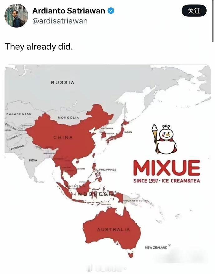 笑死我了,国外一个网友发帖说“这些国家应该组建自己的欧盟”他用红色专门标出了他指的国家,差不多包括中日韩、东南亚国家和澳大利亚。这些国家之间的利益冲突非常大,首先中日韩就很难成立一个像欧盟这样的联盟。澳大利亚以五眼联盟自居,当然也不会想和东亚、东南亚国家一起合作。只能说是欧洲不懂键政的网友的瞎想。但是,有趣的是另一个网友指出,这个联盟已经建立了,就是蜜雪冰城加盟圈。蜜雪冰城已经开遍了日本、韩国、各个东南亚国家以及澳大利亚。在印尼、越南等国家非常受欢迎。消息传回中文互联网,有梗的网友纷纷开始给这个联盟想名字。有一个嘴毒的网友想了一个名字,获得了超高点赞。这个很贱的名字叫——大蜜雪共荣圈