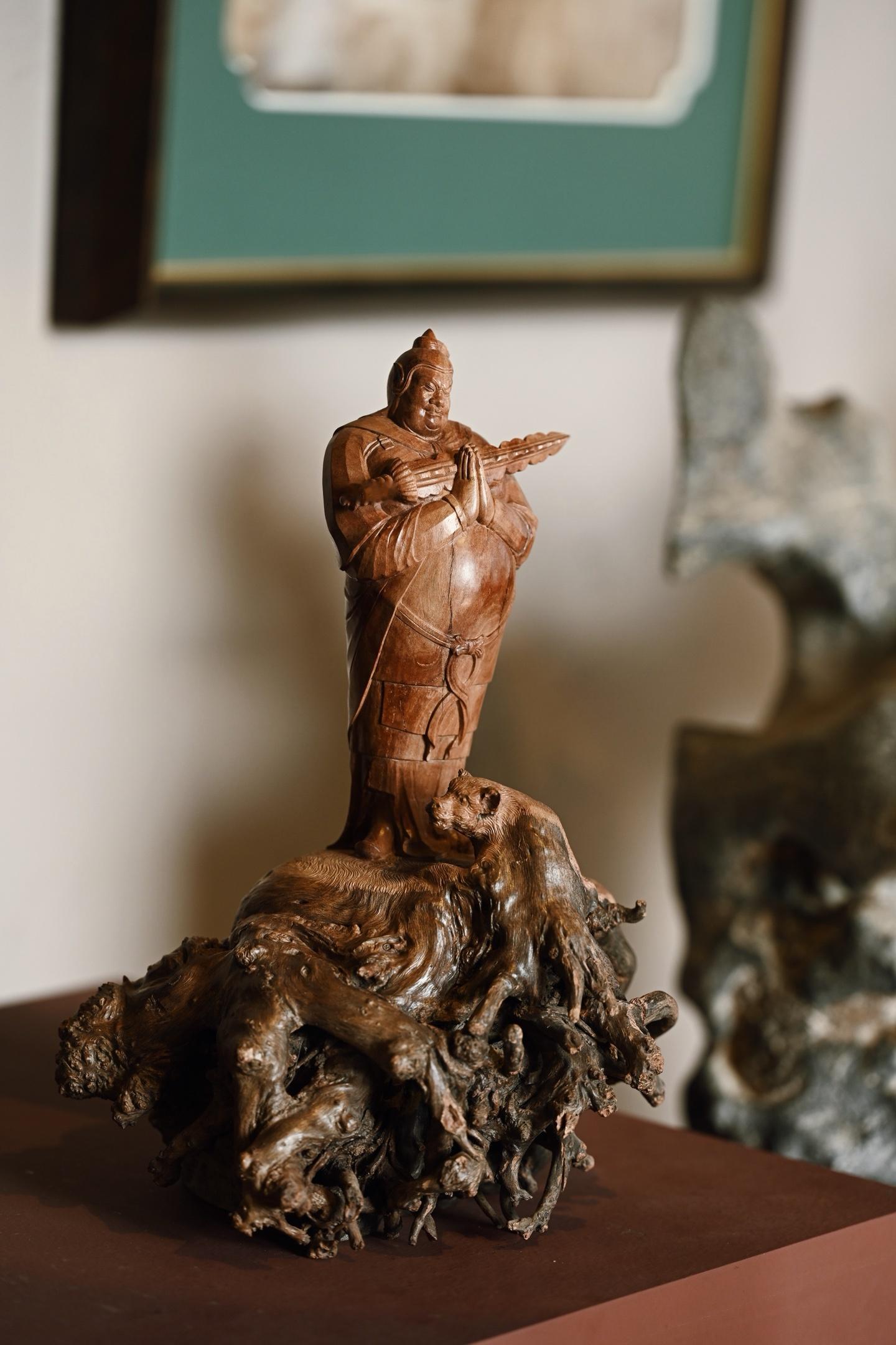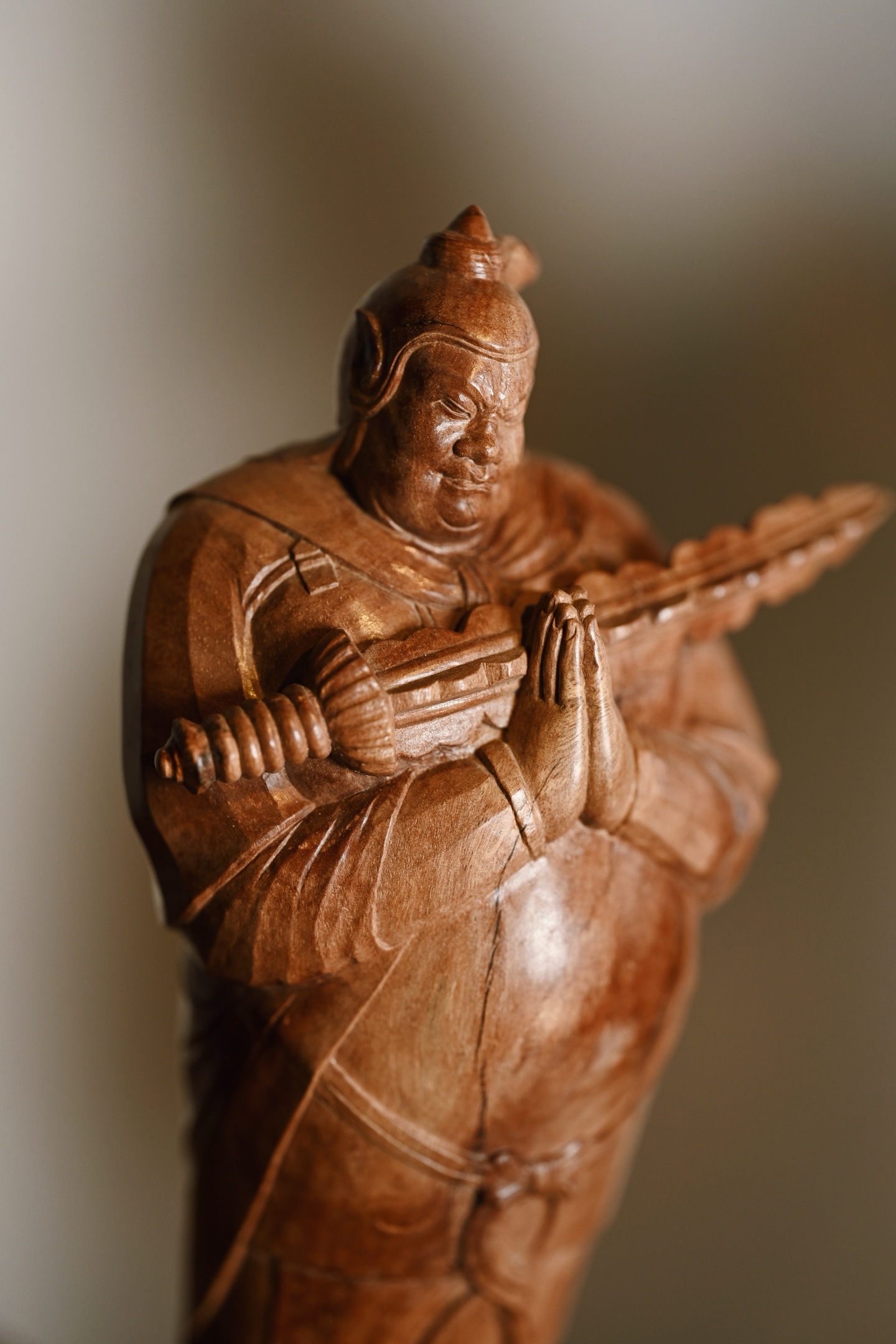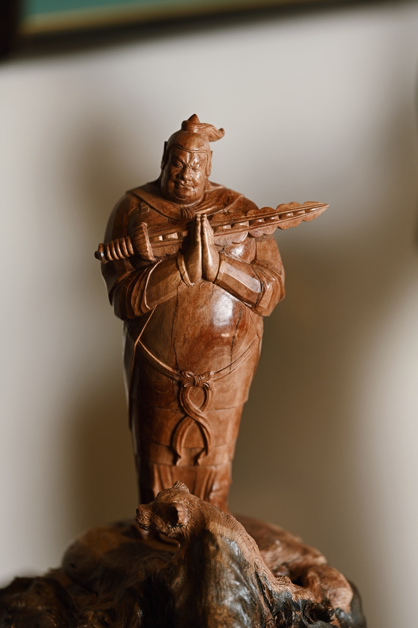 荔枝木 | 韦陀 小摆件整料雕刻,天然瘤疤冲击视觉,韦陀头戴凤翅兜鍪盔,相容坚毅,袍袖翻飞,姿态英武,韦陀双手合十,将金刚杵横抱于胸前,含威不露,奇伟神武。20*14*29cm 1208g