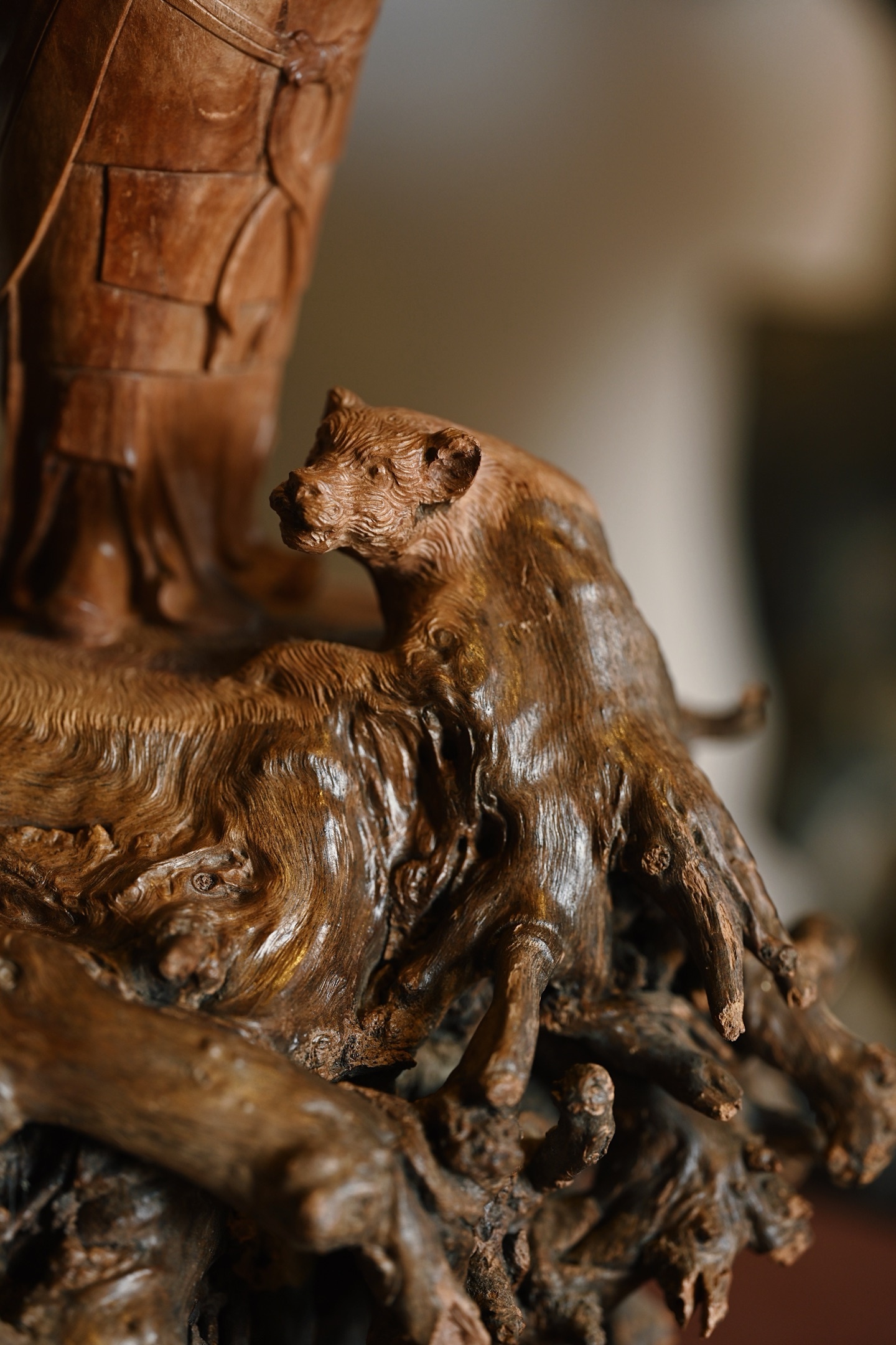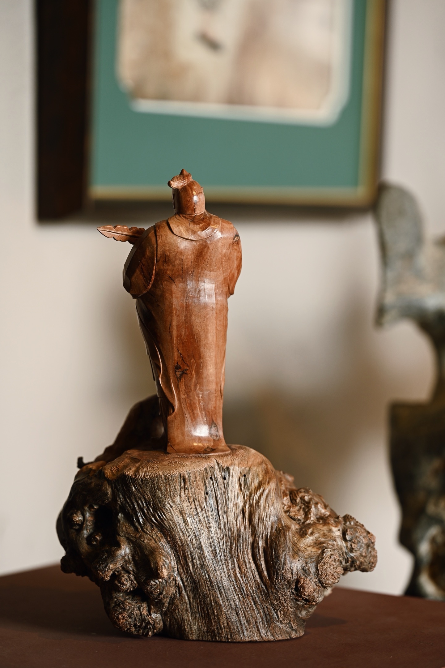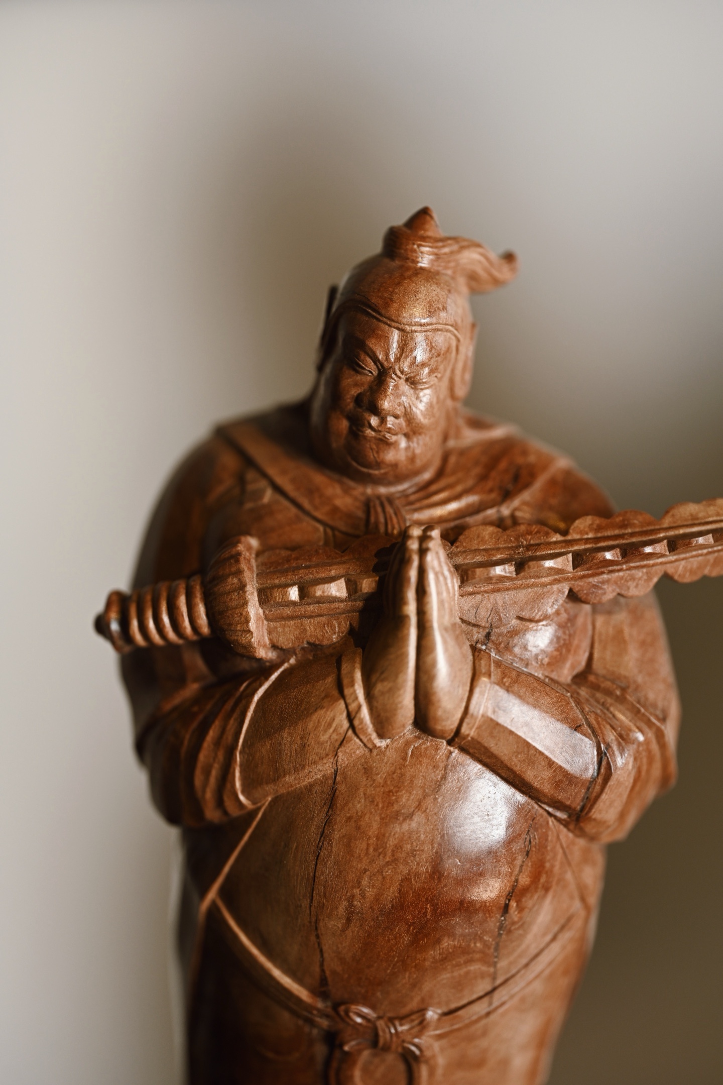 荔枝木 | 韦陀 小摆件整料雕刻,天然瘤疤冲击视觉,韦陀头戴凤翅兜鍪盔,相容坚毅,袍袖翻飞,姿态英武,韦陀双手合十,将金刚杵横抱于胸前,含威不露,奇伟神武。20*14*29cm 1208g