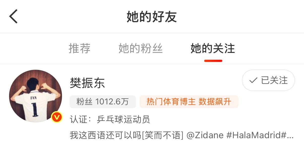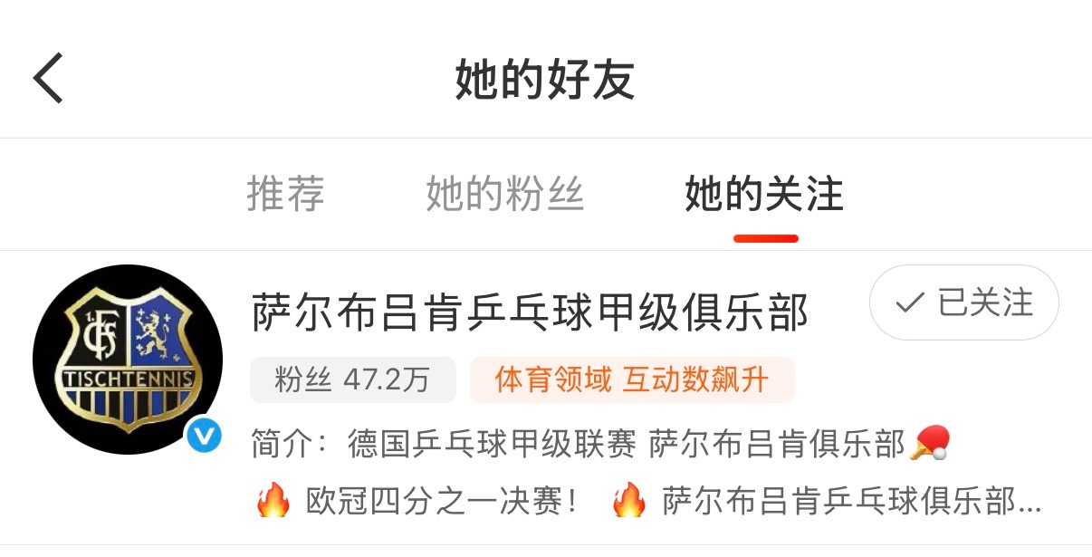 原来是这位!我刷到过她的视频,看她微博还关注了樊振东和萨尔布吕肯俱乐部