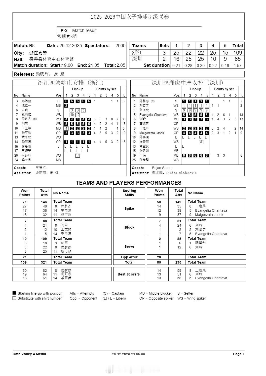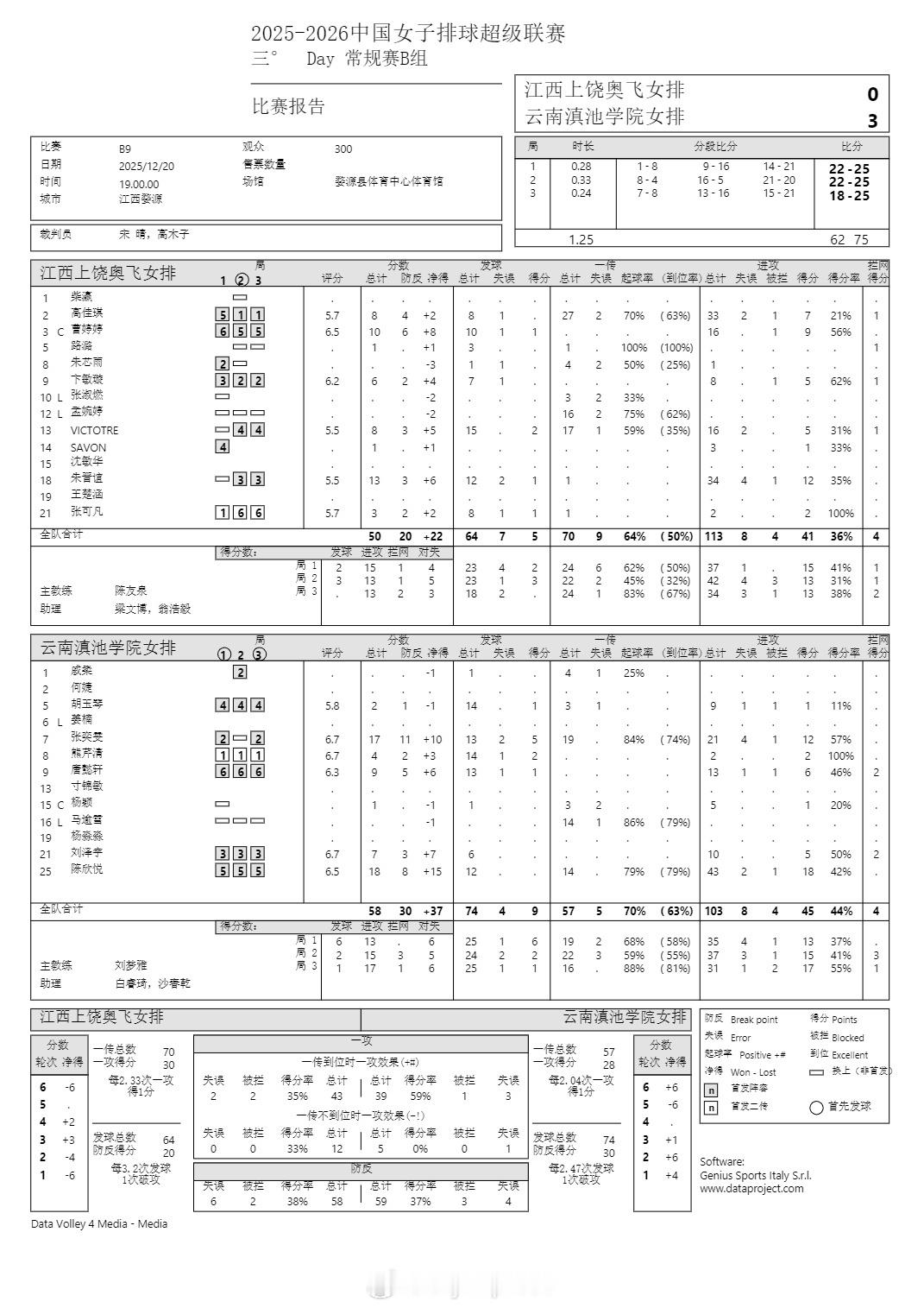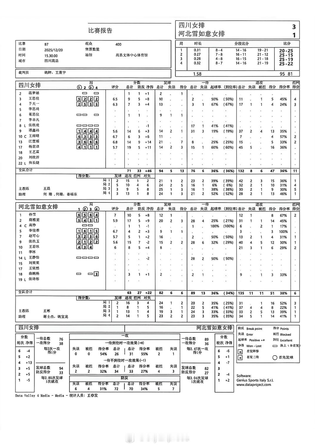 【排超女排联赛本轮B级比赛赛果和技术统计】排超联赛 12月20日,女排联赛3场B级赛赛果如下(主队在前),技术统计见图:四川3-1(20-25/25-15/25-19/25-22)河北浙江3-2(25-16/22-25/22-25/25-10/15-9)深圳江西0-3(22-25/22-25/18-25)云南
