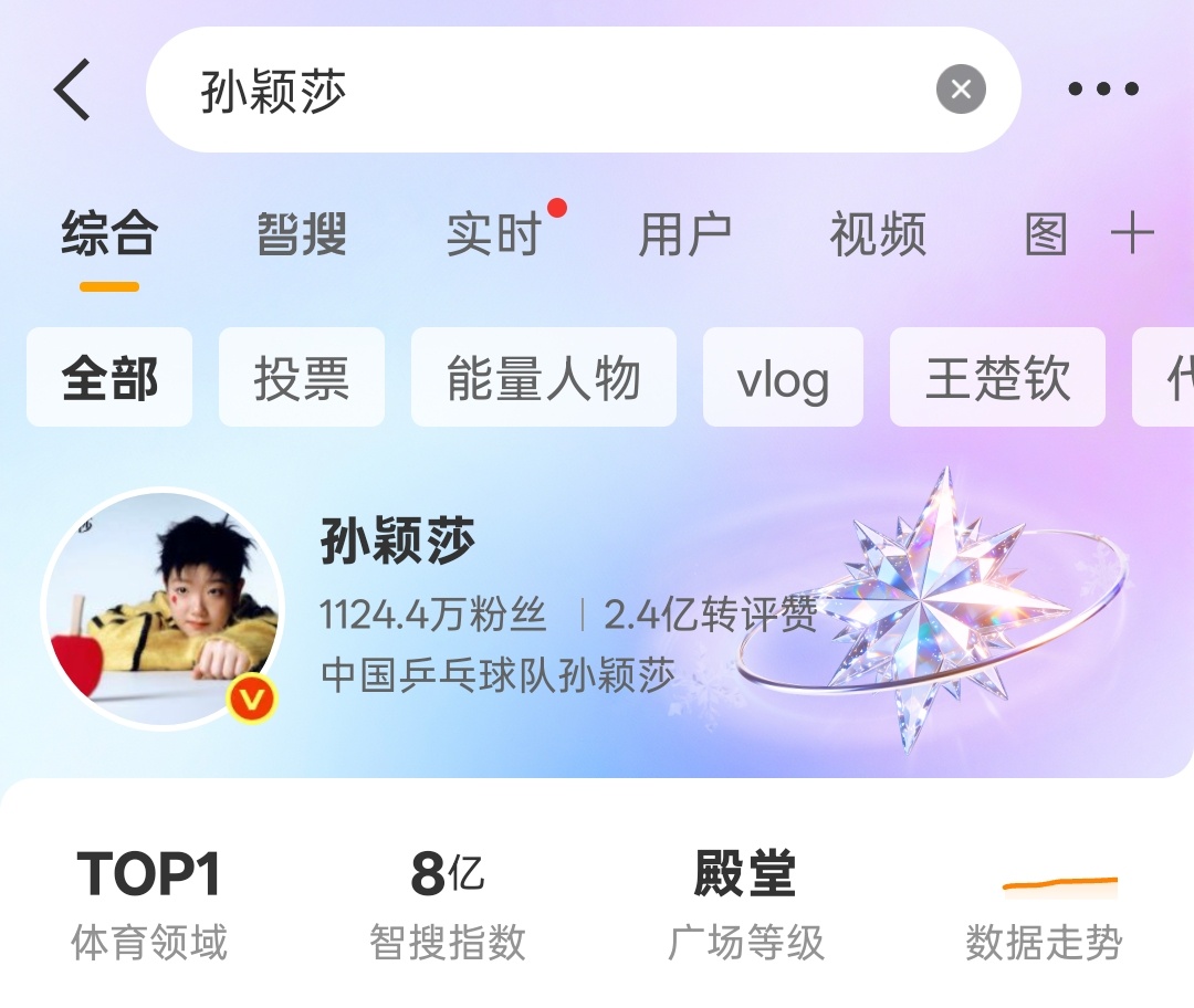 截止到现在孙颖莎智搜指数破6亿🔥🔥🔥全平台唯一☝🏻且不限圈TOP1☝🏻
