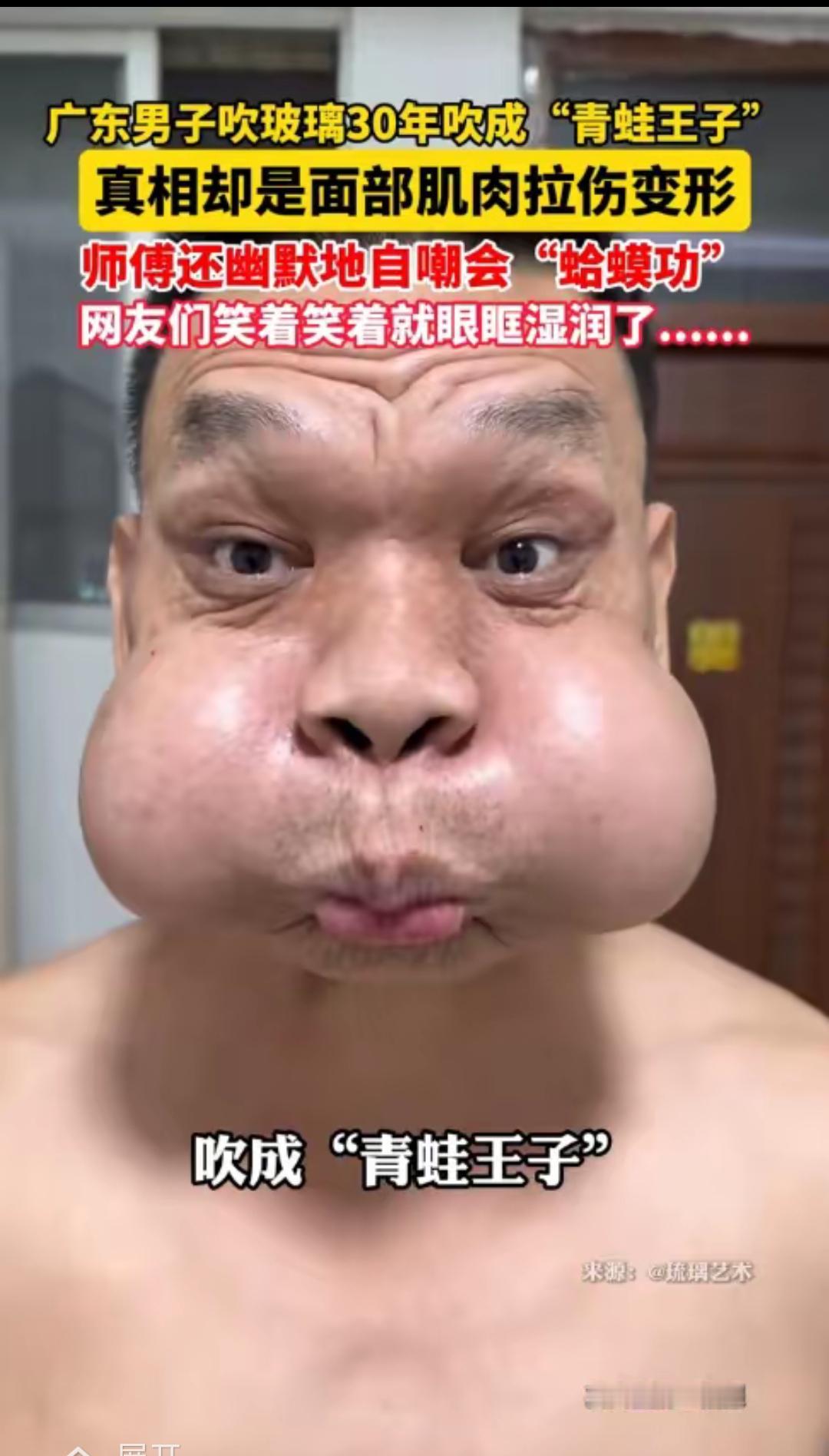 “悲剧还是发生了!” 广东,一男子在工厂吹了30年玻璃,一天最多要吹300多个,结果腮帮子变大,面部肌肉严重拉伤,鼓起气来就像青蛙一样!有时男子还调侃自己练成了“蛤蟆功”,可网友看后表示:笑着笑着就哭了! 据媒体12月19日的报道,张先生是一名玻璃厂的员工,工厂平时会生产一些玻璃制品,而在车间内,为了增加产品的合格率,这些玻璃制品需要工人们用嘴去吹气 医生都说了,这就是典型的职业病。天天吹气,面部肌肉反复拉扯,时间长了不变形才怪。一天几百个,一干三十年,铁打的身子也扛不住。 这事挺让人心酸的。传统工艺需要人守着,可代价是拿身体硬扛。现在明明有机器能代替,厂里为了省成本,还是让人用嘴吹。劳动保护天天讲,真落到工人头上就变了味。 咱们看着像个笑话,心里得清楚,这背后是实实在在的辛苦。张先生用一张变形的脸,换来了三十年手艺,也换来了咱们用的玻璃瓶子。这份坚守让人佩服,但这种牺牲本不该发生。
