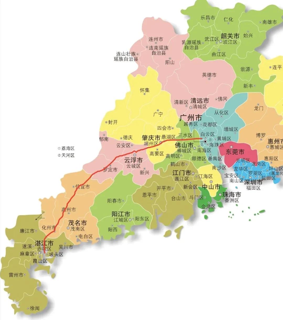 广州与粤东粤西的高铁动车为什么靠的那么近?广东12月22日迎来2条高铁,汕汕增加汕头-汕头南,粤西也多了条广湛高铁。大家看看图1,广州到湛江,到了阳江后,广湛高铁与深湛动车(江门至湛江段)几乎重叠了;而广州到汕头的高铁动车两条线路也差不多这样重叠的走向。当初为什么这样设计?为什么不选择图2的走向?图2的罗定、信宜、高州、化州都是人口超百万的人口大市,现在好了,连毛都没一条!