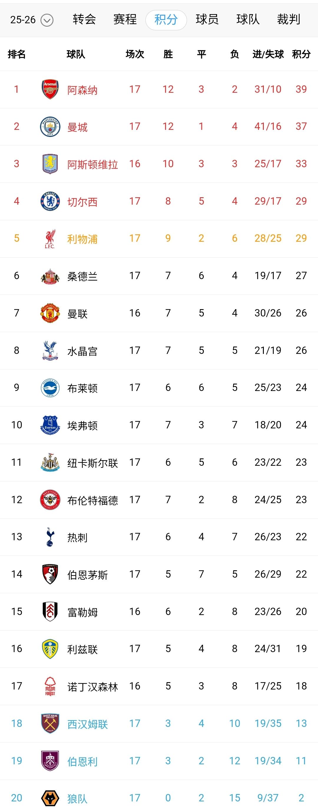 利物浦也是好起来了,各项赛事三连胜!积分进入欧联区。 利兹联主场大胜水晶宫,逐渐拉开与降级区的分数,已领先降级区6分。 阿森纳只比曼城多2分,想拿下本赛季英超,难度有点大。 狼队收获本赛季第15场败仗,赛季首胜迟迟未到,降级没跑了。