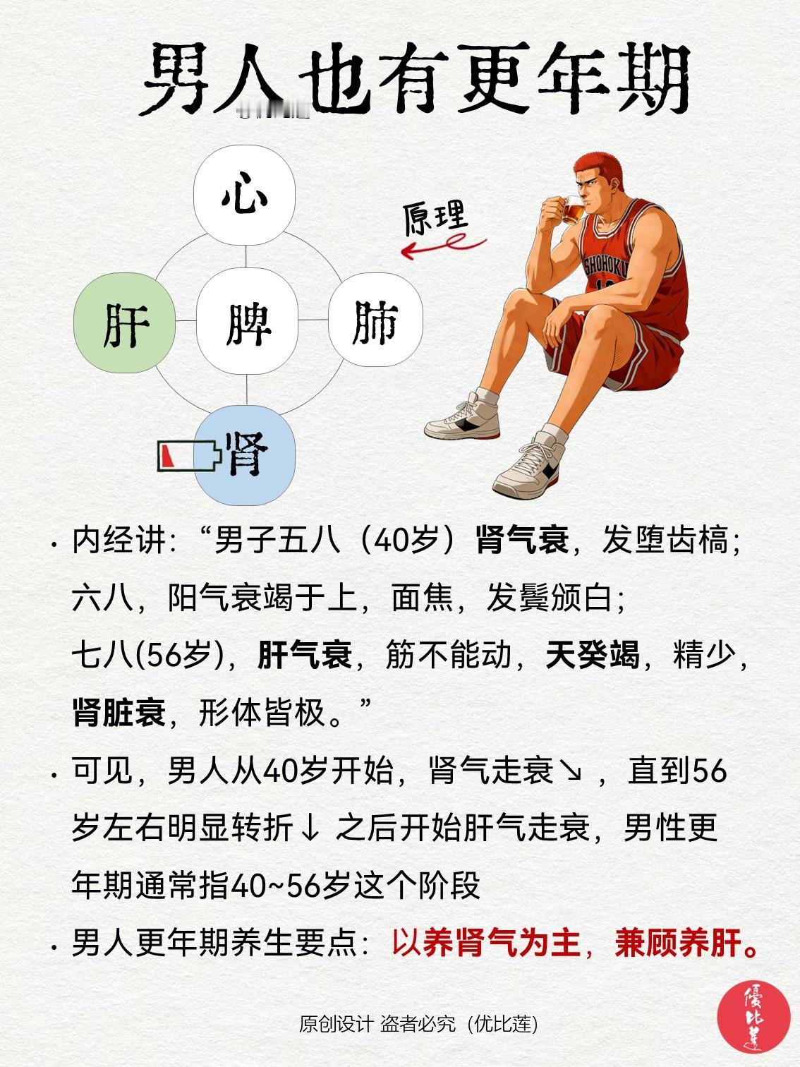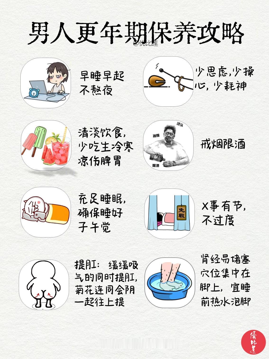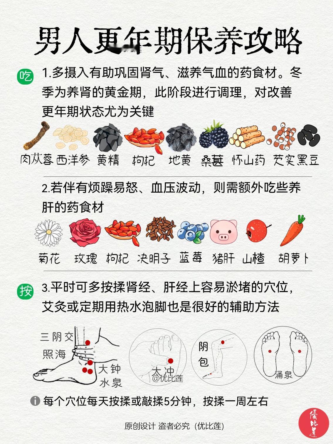 男人也有更年期❗️ 常见证状:烦躁易怒、掉发、白发、自信心下降、体力下降、疲倦乏力、啤酒肚、易出汗、睡眠障碍、X欲减退、血压不稳 男人从40岁开始,肾气走衰↘ ,直到56岁左右明显转折↓ 之后开始肝气走衰。 男性更年期通常指40~56岁,养生要点:以养肾气为主,兼顾养肝。 1. 多摄入有助巩固肾气、滋养气血的药食材。冬季为养肾的黄金期,此阶段进行调理,对更年期状态尤为关键。 2. 若伴有烦躁易怒、血压波动,则需额外吃些养肝的药食材 3. 平时可多按揉肾经、肝经上容易淤堵的穴位,艾灸或定期用热水泡脚也是很好的辅助方法 4. 早睡早起不熬夜 5. 少思虑,少操心, 少耗神 6. 清淡饮食,少吃生冷寒凉伤脾胃 7. 戒烟限酒 8. 充足睡眠,确保睡好子午觉 9. X事有节,不过度 10. 提肛:缓缓吸气的同时提肛,菊花连同会阴一起往上提 11. 肾经易堵塞穴位集中在脚上,宜睡前热水泡脚 年少时,看不懂为什么要“保温杯里泡枸杞”,人过40岁,突然就明白了~ “初闻不知曲中意,再闻已是曲中人” 更年期男性更年期