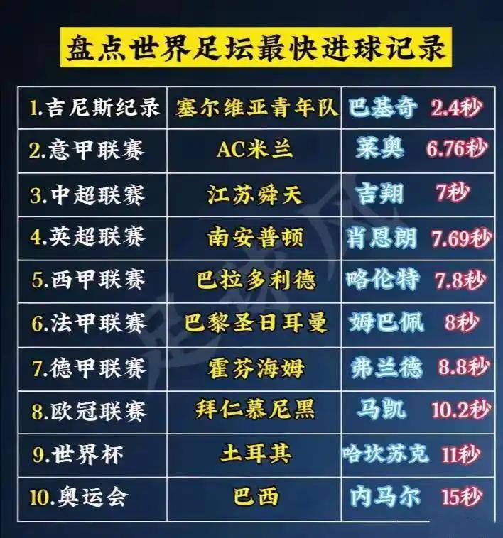 世界上还有2.4秒的进球? 我记得以前天下足球计算过,比赛一开场,把中场的球踢进对面门框,至少4秒。 所以我们江苏队的7秒,已经是极限啦。 没想到还有6秒,2秒?? 姆巴佩有个8秒进球,厉害。[偷笑]