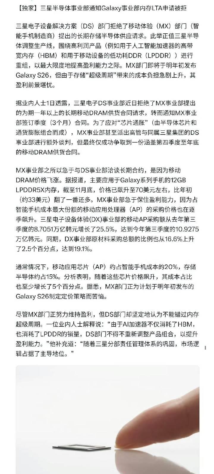 啊这[捂脸]因为内存涨价,三星半导体部门和三星手机部门都谈崩了? 半导体部门想抓住这波机会盈利,把内存供应高价向AI需求方倾斜,对自家手机部门想便宜点进货置之不理。。难怪三星S系列开始用镁光的内存,估计比自家的便宜[呲牙]