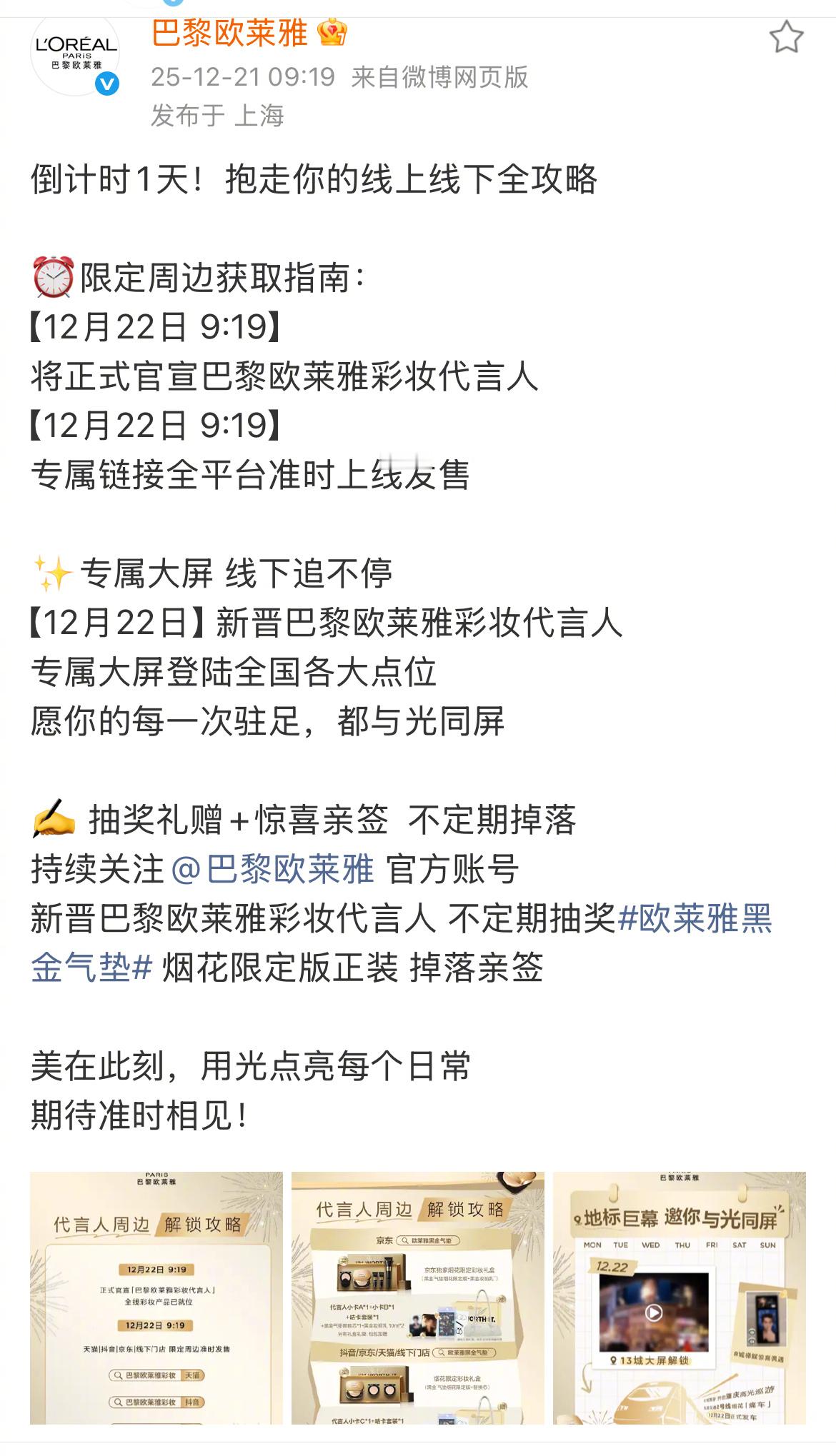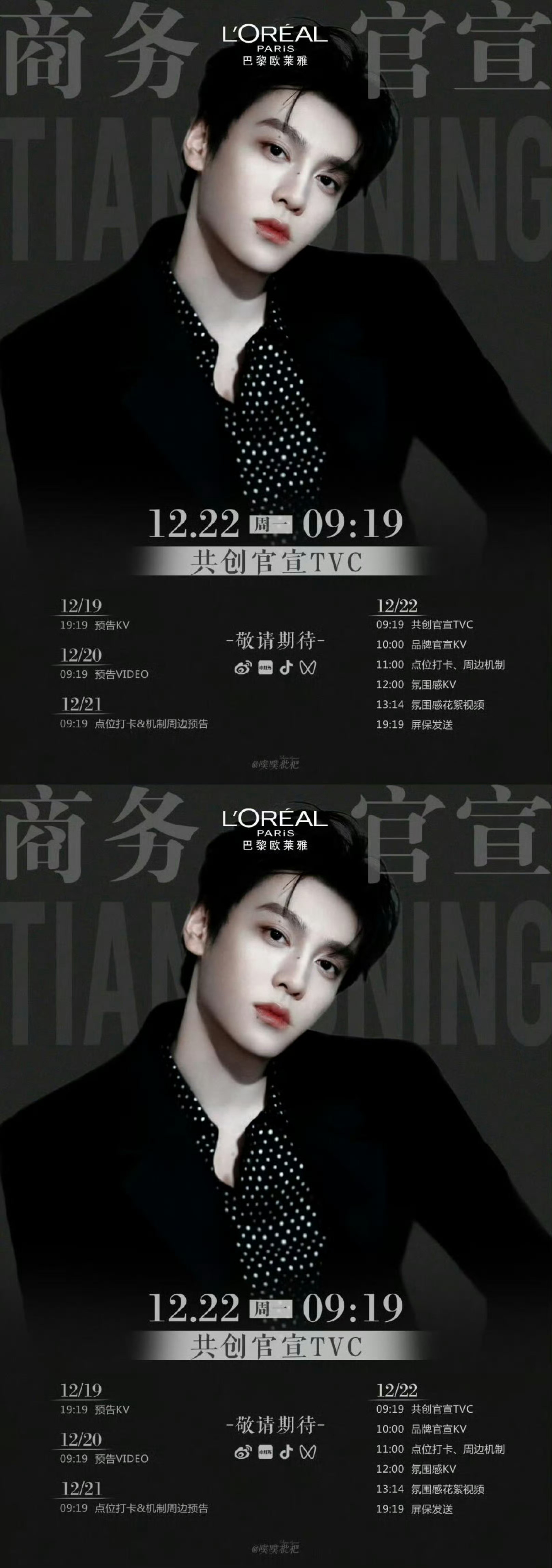 田栩宁欧莱雅线上线下全攻略预热!排面拉满!明天彩妆代言人田栩宁正式官宣,还有专属链接专属大屏,燥候😍
