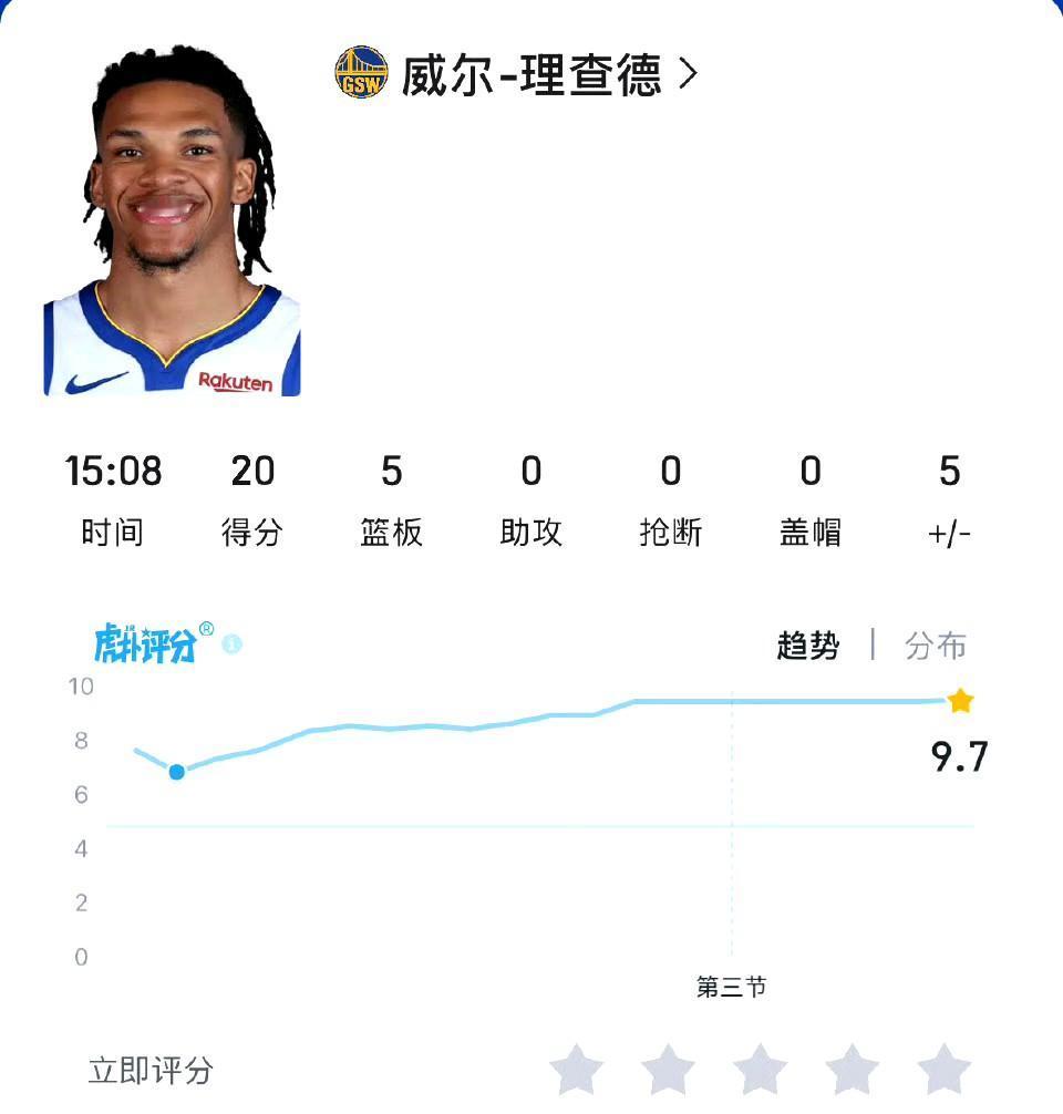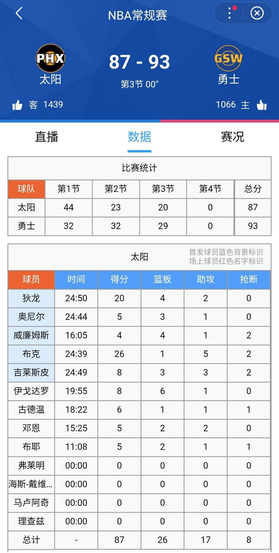 三节结束,勇士反超了6分,勇士93-87太阳,勇士似乎找到了取胜的砝码,看到胜利的曙光。 理查德,他值得更多上场时间,上场15分钟得了30分,命中率100%,第四节有了他,勇士必定取胜。 除了第一节没打好,第二节第三节勇士总得分超过太阳18分。