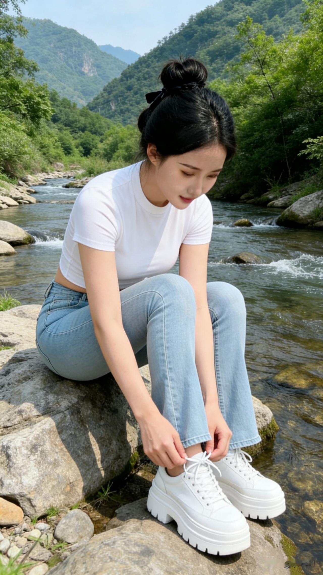 《溪涧佳人》 翠岭连绵映碧流,石矶倩影惹清眸。 云鬟高绾簪琼佩,素袂轻扬揽素秋。 步踏苍岩疑舞鹤,身临寒涧若浮鸥。 闲依怪石濯纤足,漫把清波拂玉钩。 凝睇峰烟心自远,低簪鞋带意悠悠。 背临溪濑舒长袖,一任风光入画楼。 不借丹青描秀色,天然风骨胜仙俦。
