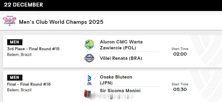 【男排世俱杯决赛日赛程对阵】国际排坛战报速递 北京时间12月22日凌晨,2025男排世俱杯将在巴西贝伦进入最后的决赛日,赛程对阵如下(北京时间): 02:00 铜牌战波兰扎维尔切vs巴西雷纳塔05:30 日本大阪布鲁顿vs意大利佩鲁贾