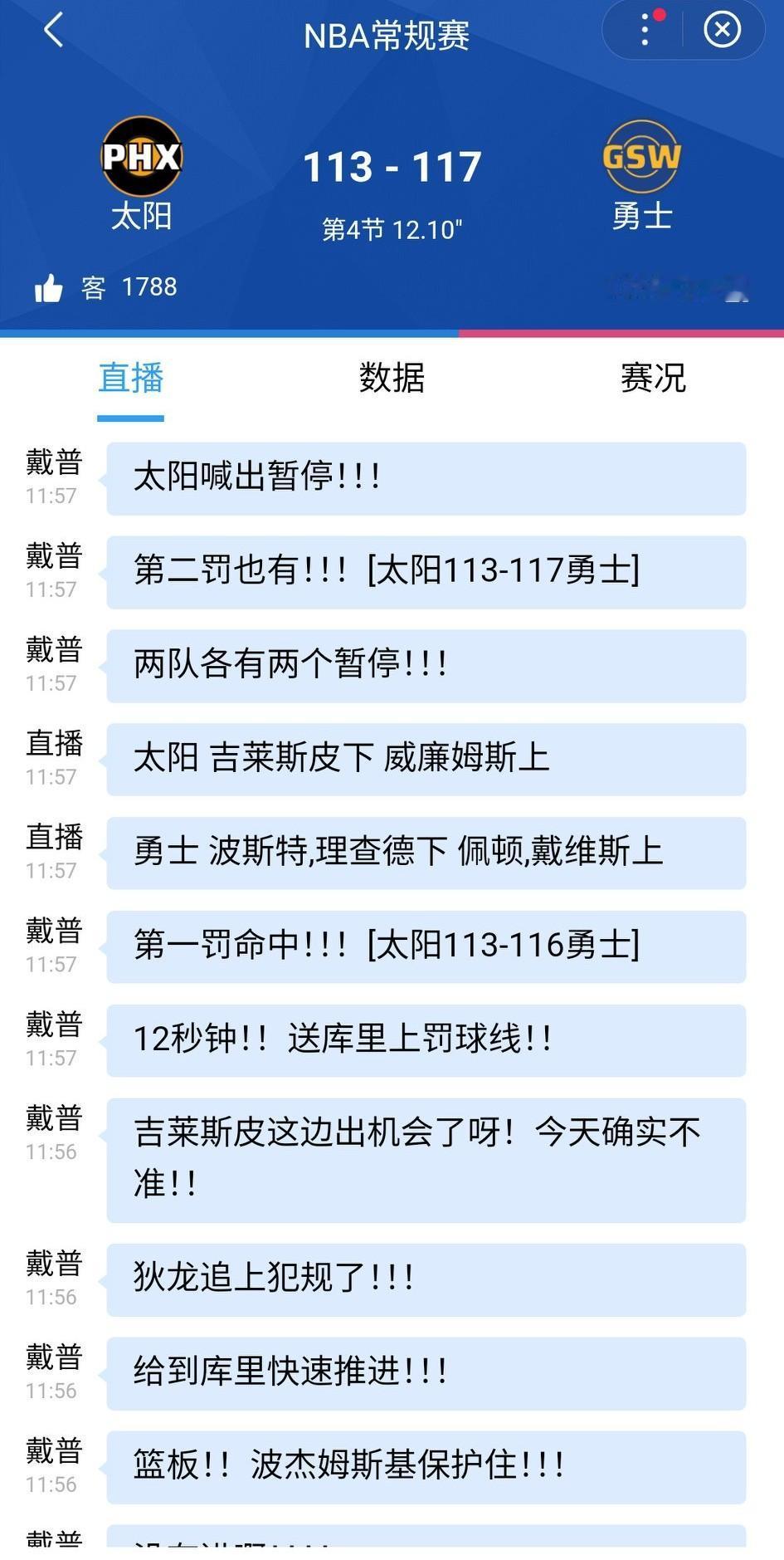 可惜了,吉莱斯皮就差一点,那个反超三分未进!这样太阳基本没了,恭喜勇士终止四连败,继续稳固附加赛席位。 还有12秒,勇士117-113太阳,两个球的差距,太阳想翻盘几乎不可能。今天的太阳后面三节确实不准。