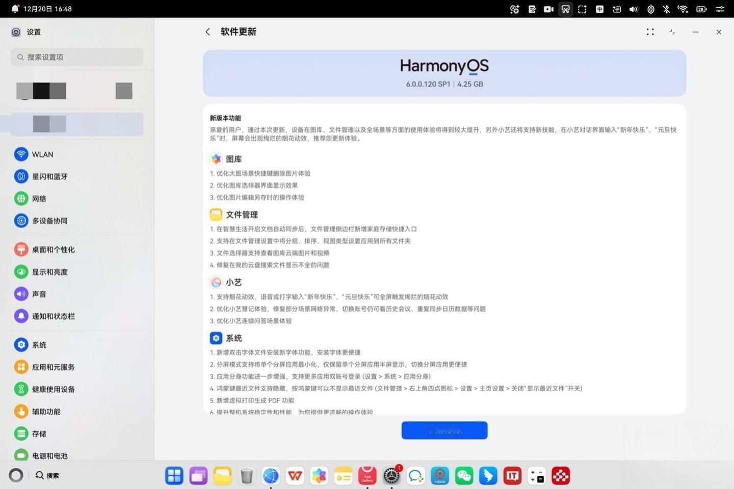 【华为鸿蒙电脑 MateBook Pro 推送 HarmonyOS 6.0.0.120 SP1 版本更新,新增烟花动效等】华为鸿蒙电脑 MateBook Pro推送 HarmonyOS 6.0.0.120 SP1 版本更新,设备在图库、文件管理以及全场景等方面的使用体验将得到较大提升。小艺将支持新技能,在小艺对话界面输入“新年快乐”、“元旦快乐”时,屏幕会出现绚烂的烟花动效。附更新内容如下:图库优化大图场景快捷键删除图片体验优化图库选择器界面显示效果优化图片编辑另存时的操作体验文件管理在智慧生活开启文档自动同步后,文件管理侧边栏新增家庭存储快捷入口支持在文件管理设置中将分组、排序、视图类型设置应用到所有文件夹文件选择器支持查看图库云端图片和视频修复在我的云盘搜索文件显示不全的问题小艺支持烟花动效,语音或打字输入“新年快乐”“元旦快乐”可全屏触发绚烂的烟花动效优化小艺慧记体验,修复部分场景网络异常、切换账号仍可看历史会议、重复同步日历数据等问优化小艺连续问答场景体验系统新增双击字体文件安装新字体功能,安装字体更便捷分屏模式支持将单个分屏应用最小化,仅保留单个分屏应用半屏显示,切换分屏应用更便捷应用分身功能进一步增强,支持更多应用双账号登录 (设置> 系统 > 应用分身)鸿蒙键最近文件支持隐藏,按鸿蒙键可以不显示最近文件 (文件管理> 右上角四点图标 > 设置 > 主页设置 > 关闭“显示最近文件”开关)新增虚拟打印生成 PDF 功能提升整机系统稳定性和性能,为您提供更流畅的操作体验优化扫码枪扫码体验优化系统虚拟化技术,完善使用系统虚拟化能力增强移动应用虚拟化兼容能力,为您提供更丰富的应用合入 2025 年 12 月安全补丁,增强设备系统安全修复跨设备传输时设备选择界面名称乱码的问题修复部分场景打印机添加成功但提示添加失败的问题修复通过 WLAN 添加打印机后,打印机状态不稳定的问题修复部分场录打印机重复打印问题修复部分场景云打印无法添加打印机问题