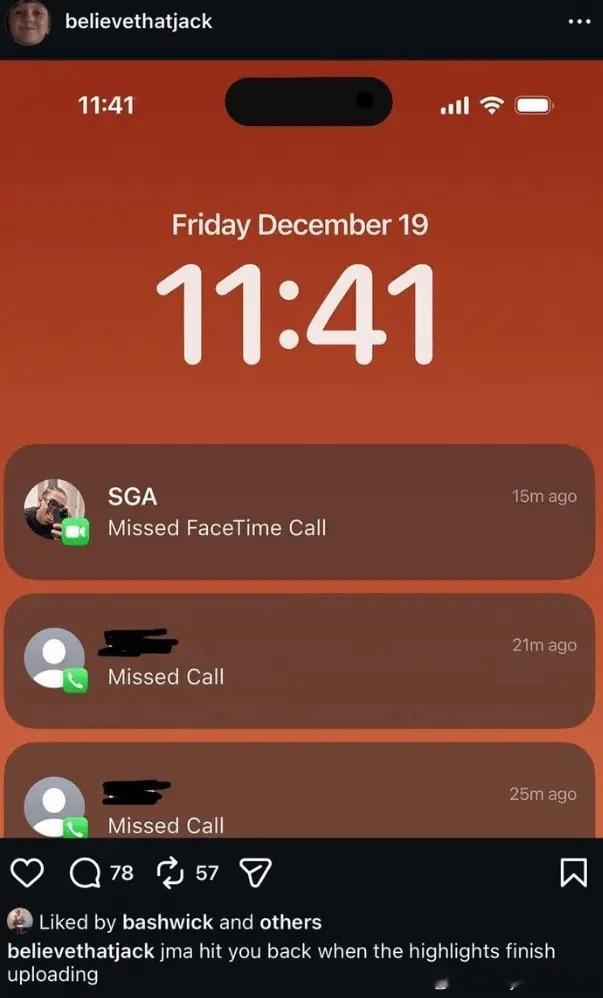 爱德华兹Instgram的小号更新,图片上显示了一通来自SGA的视频通话请求,爱德华兹配文写道:“等比赛集锦上传完成了我就打回去。”