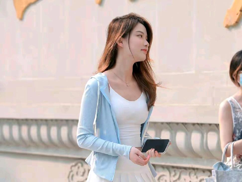 街头的浅蓝与白 晴日的街头,她踩着运动鞋走过来 浅蓝的开衫松松搭在肩头,白百褶裙晃出细碎的褶子 抬手拢头发的瞬间,笑眼弯成了月牙 像风把云朵揉碎了,撒在人间的模样 走过刻着金字的墙,脚步轻得像踩在棉花上 手机捏在手里,目光望向前方时 睫毛在阳光下投出浅浅的影 转身迈步的背影,长发随步伐飘起来 浅蓝与白的配色,在人群里清清爽爽的 像夏天刚打开的冰镇汽水,冒着甜甜的泡 城市的街道总挤满匆忙的人 而她就像一抹轻快的风,掠过石板路 把青春的鲜活,揉进了寻常的午后 原来美好从不用刻意装扮 是这样一身简单的衣,一个舒展的笑 就把街头的风景,变得温柔又明亮浅蓝粉裙 穿搭