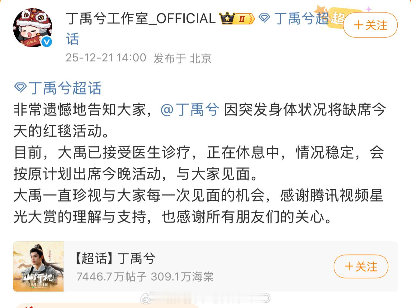 丁禹兮因突发身体不适,不出席红毯了,帅哥好好休息,期待今晚的活动!!