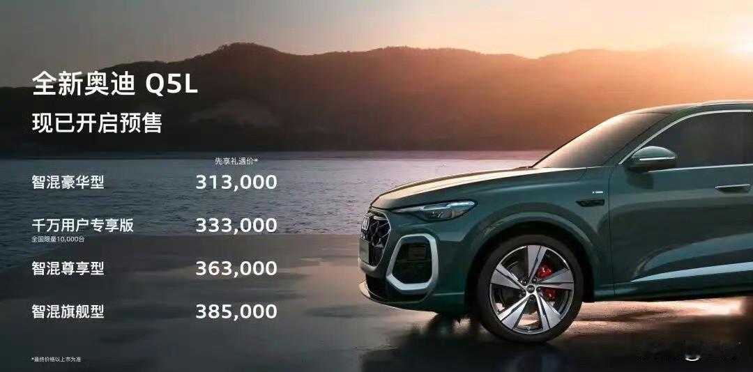 31.3万,新奥迪Q5L这个价格怎么样? 作为一个10多年的车型,这一次新的Q5版本又一次迭代了,有人说这个车之前价格不是这么回事,现在30出头,是不是我们国产新能源汽车的竞争,太过于激烈导致的[捂脸] 其实从某种程度上来说,这个车的消费群体,和国产新能源汽车的潜在用户是不一样的,毕竟这个车已经更新迭代这么多年了,他能够再这么多年价格一直坚挺着,就是因为他有一大群比较忠实的用户。 而且前两天豪华车型的年度报告出来之后,发现前面五名当中卖得比较好的分别是特斯拉、奔驰,宝马,奥迪,这几个品牌过了之后才是鸿蒙智行。 就是说,其实像奔驰宝马奥迪这种传统品牌,他们比较较热门的车型,其实销量还是不愁的,因为截止上个月底这些品牌都卖过了,超过500,000台。 所以300,000出头,对于喜欢传统的豪华品牌汽车用户户而言,他们应该是不觉得很贵的,当然喜欢国产新能源汽车的人会马上拿着腾势,蔚来,理想,小米,小鹏,零跑,问界等等系列,与这些车比配置,比底盘,甚至比辅助驾驶。 但很明显,这是两批完全不同的用户,所以有时候还真的不能够这样比,因此对于喜欢这个品牌的你来说,这个价格应该还是在预判的范围之内吧,您觉得这四个配置中,哪一个会成为热门版本?