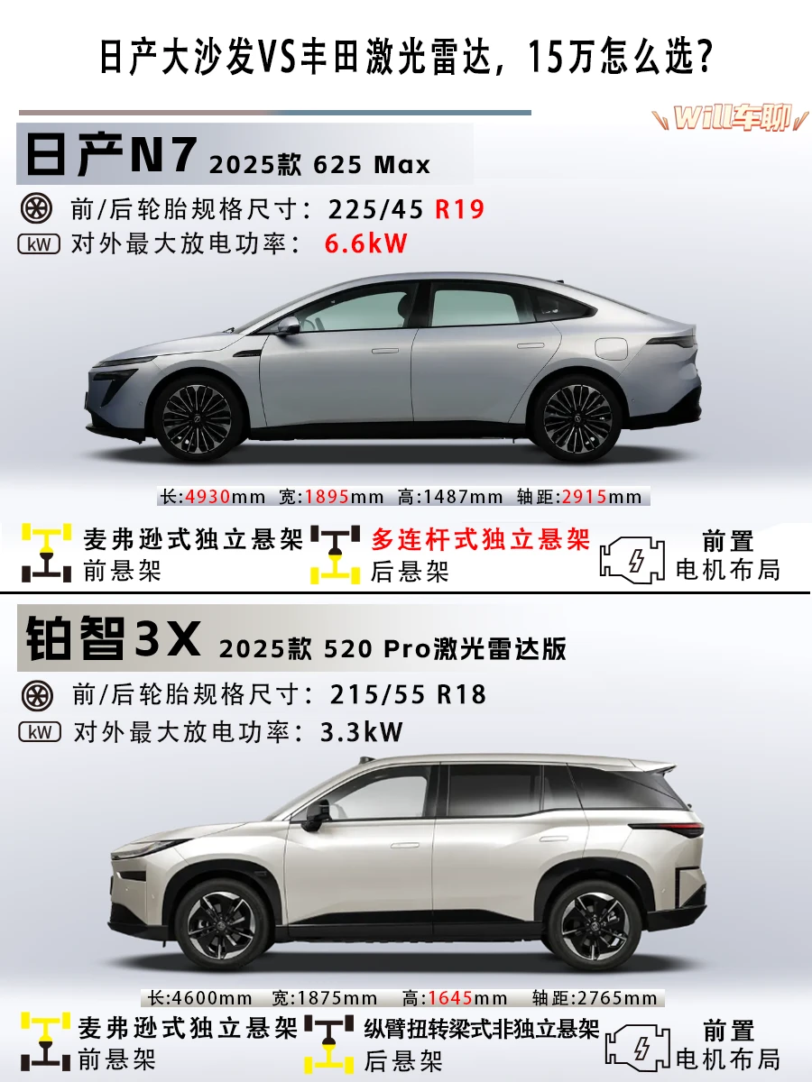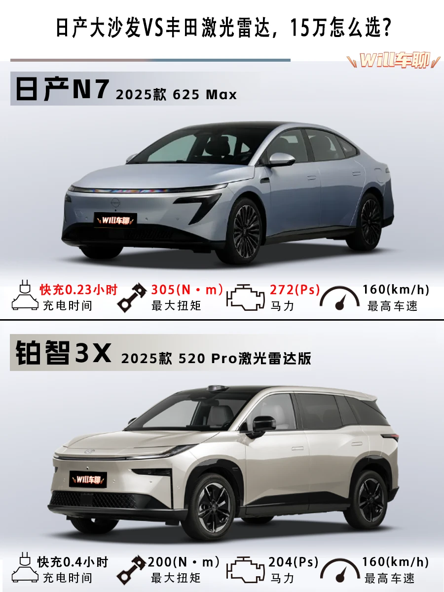 今天对比两款顶配:日产N7 625 Max和丰田铂智3X 520 Pro激光雷达版。