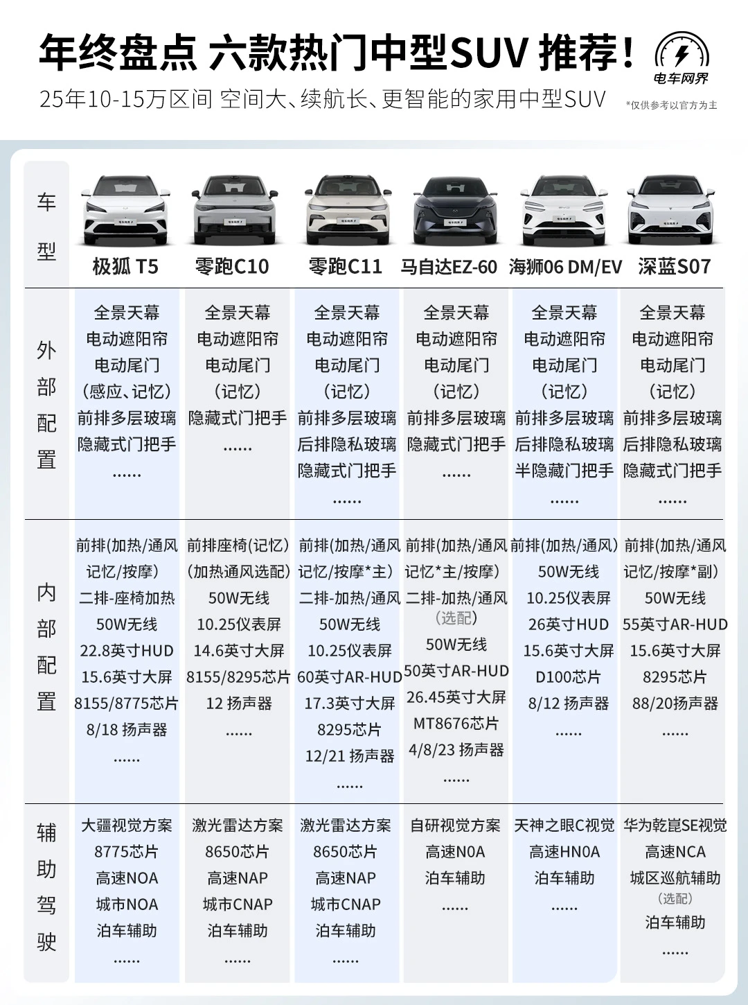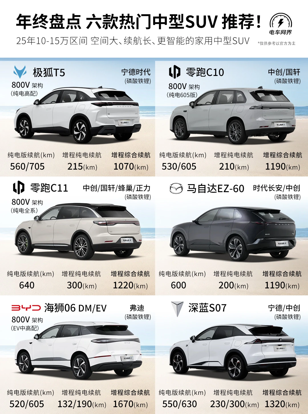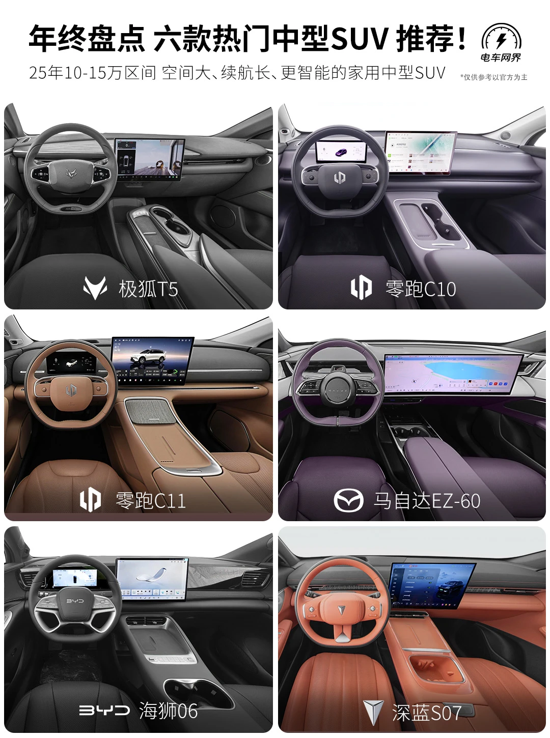 年终盘点,这六款主销区间10-15万级,空间大、续航长、更舒适、更智能的家用中型SUV,:极狐T5、零跑C10、零跑C11、马自达EZ-60、海狮06、深蓝S07,谁才是你心中的不二之选呢?