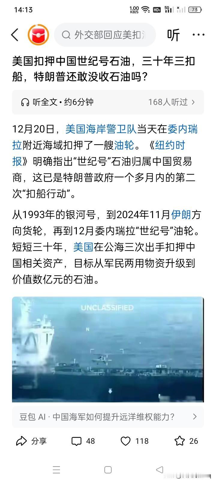 谁掏钱? 美国海岸警备队在美军的配合下,又扣押了一艘从委内瑞拉港口开出来的大型油轮。不巧是,据传闻说,这艘油轮上的货物归属我们的石油贸易商。 这一下,不是我们麻烦大了,而是美国又闯下大祸。美国欺负委内瑞拉已经不是一时半会儿的事情了,但如果欺负我们,大概没有那么简单容易。就像美国对全世界的国家,想加关税就加关税,但对我们这个庞大的经济力量的客体来说,却完全不是那么回事。然而,既然是被扣押,经济损失肯定是避免不了的,问题就是,谁最终来承担这经济损失,也就是谁来承担这件事情的最区责任,这才是问题的关键。