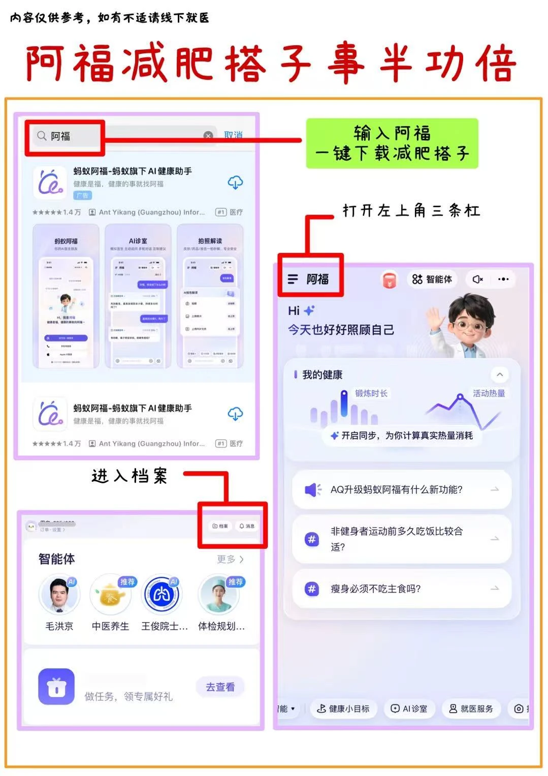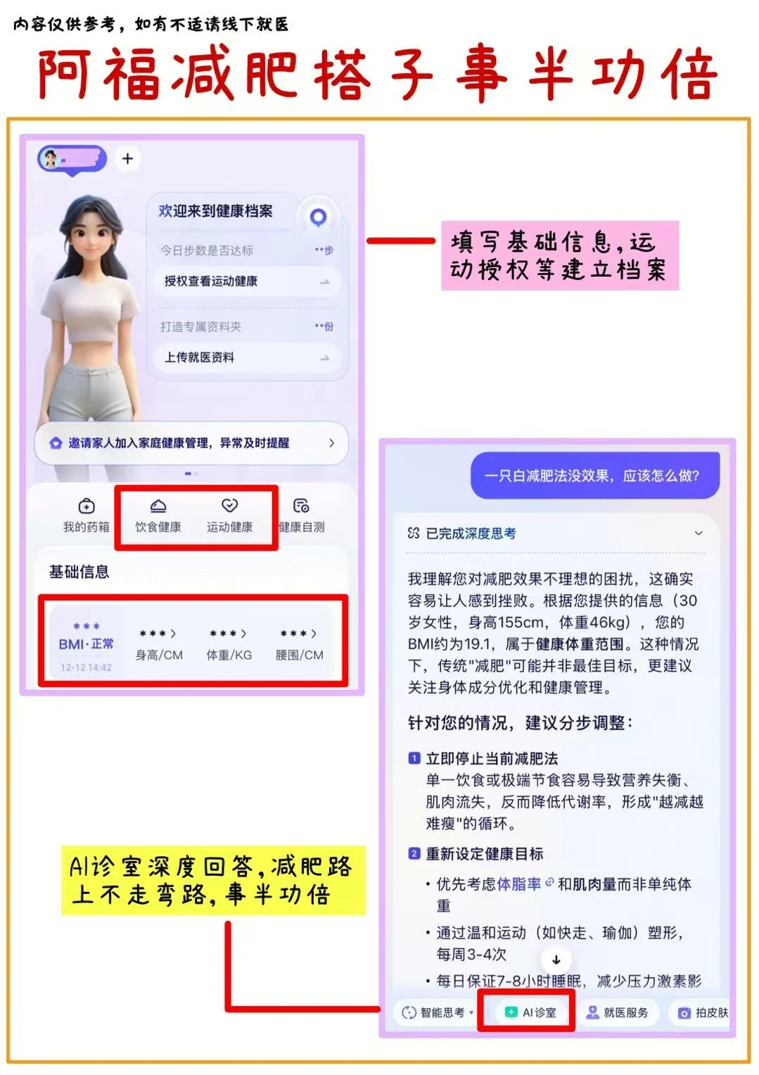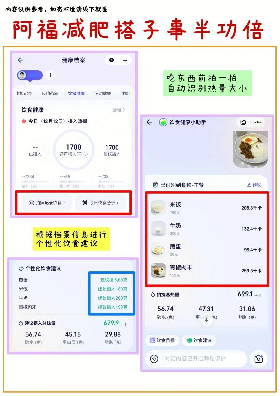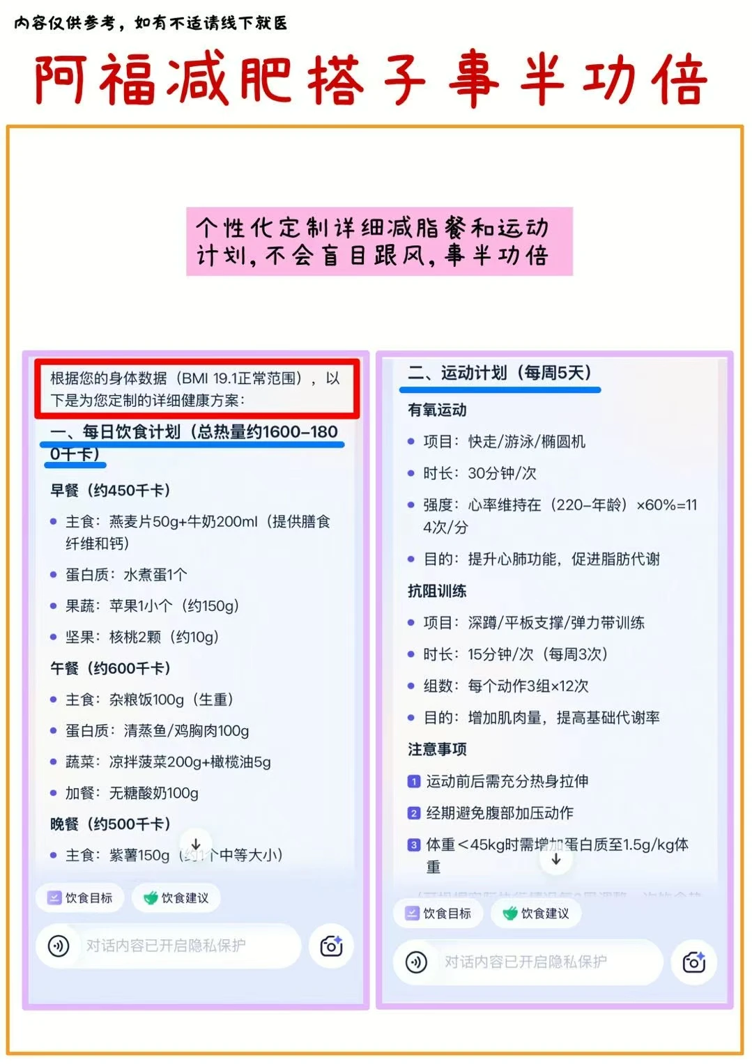 而且阿福会根据健康档案给个性化建议,比如它知道我BMI正常,就把一只白减肥法的食谱微调了——早餐加了2颗核桃补优质脂肪,晚餐把香蕉换成了紫薯,说这样更适合我塑形。原来减脂减肥吃这些,不用饿肚子,腰腹的肉反而紧实了不少~