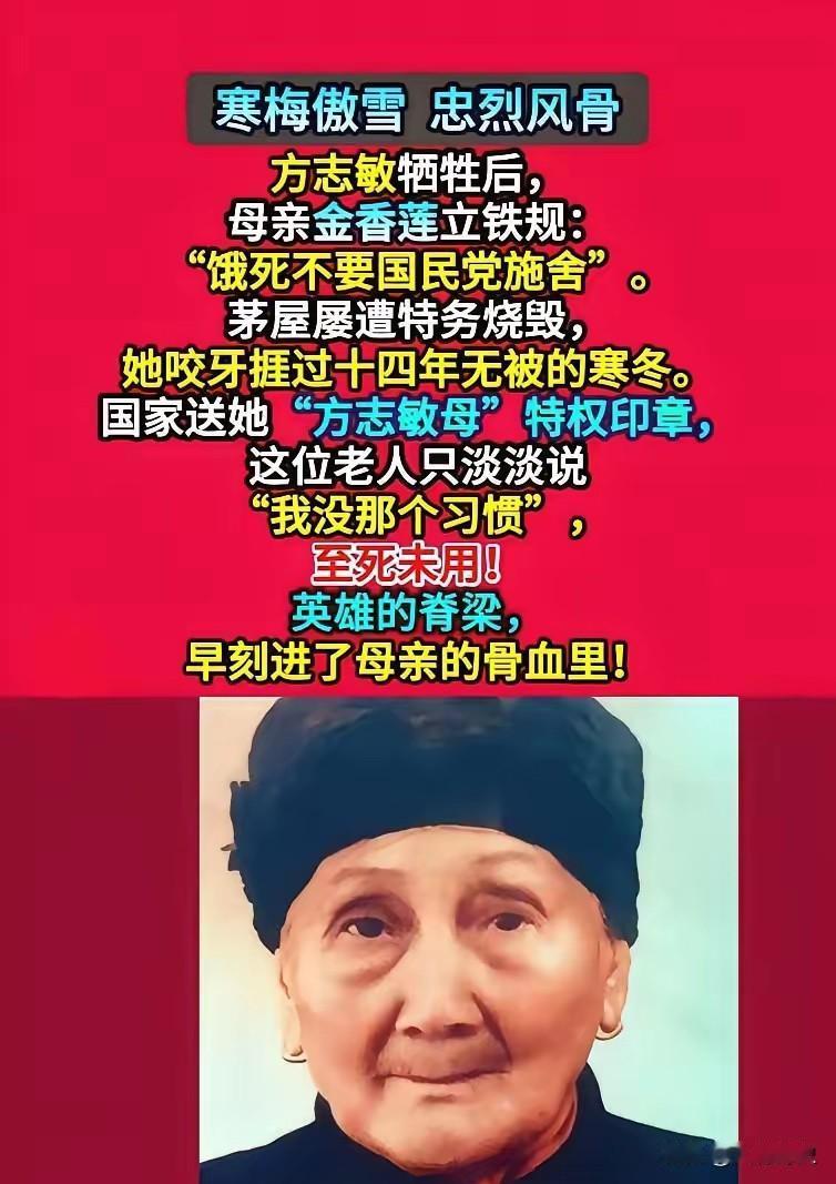 泪目!十四年没被子的寒冬,这位烈士母亲的骨气,比钢铁还硬! 十四年没有被子的寒冬有多难熬?可这位母亲愣是凭着“饿死不沾国民党施舍”的家规扛过来了。国家给的特权印章说不用就不用,那句“没那个习惯”,藏着比钢铁还硬的骨气,她的坚守,是对儿子最好的告慰,向这位伟大的母亲致敬!方志敏的母亲 这位老人就是方志敏的母亲金香莲。当年方志敏投身革命,把“为天下穷人谋出路”的信念刻进骨子里,家里的田地很快就被国民党反动派尽数没收,茅草屋被烧得只剩断壁残垣,她带着几个年幼的孩子,躲进深山的破窑洞里艰难度日。数九寒天,窑洞里四处漏风,别说棉被,连件完整的棉衣都凑不齐,孩子们冻得直哭,她就把孩子们搂在怀里,用自己单薄的粗布褂子裹住他们,整夜搓着孩子们冻僵的手脚取暖,自己却冻得嘴唇发紫、浑身打颤,实在熬不住了,就捡些干柴拢成小火堆,守着微弱的火苗盼着天亮。 国民党曾派人找上门,拎着一袋白面和几块银元,阴阳怪气地说只要她劝方志敏“回头”,就能保全家衣食无忧。金香莲盯着那袋白面,又看了看饿得面黄肌瘦的孙辈,喉结动了动,却硬是咬着牙把来人骂出了门:“我儿干的是救百姓的大事,你们这些害人精的东西,我们家一口都不碰!”从那天起,她就把“饿死不沾国民党施舍”这句话立成了家规,哪怕挖野菜、啃树皮、嚼草根,也绝不弯腰低头。 方志敏不幸牺牲后,反动派还想拿老人做文章,又一次上门威逼利诱,可她拄着拐杖,颤巍巍地站在窑洞门口,指着反动派的鼻子骂:“我儿虽死,骨头是硬的!我金家没有软骨头!”这话掷地有声,愣是把反动派吓得悻悻离去。新中国成立后,政府感念方志敏的功绩,特意派人送来救济款和一枚能享受特殊优待的印章,工作人员反复劝说这是她应得的补偿,老人却只是摆摆手,淡淡说了句“没那个习惯”。 她把印章原封不动地退了回去,依旧守着老家的几亩薄田,自己种菜、纺线,日子过得清贫却踏实。有人问她,守着这么大的功劳,何苦过得这么苦?老人坐在门槛上,摩挲着方志敏生前用过的砚台,眼眶泛红却语气坚定:“我儿为了让天下穷人过上好日子丢了性命,我要是借着他的光占便宜,怎么对得起他,怎么对得起那些牺牲的红军战士?” 寒来暑往十四年,没有棉被的冬夜,她靠着稻草和一腔骨气熬了过来;风雨飘摇的岁月里,她靠着“不拿群众一针一线”的信念守住了本心。她不是什么大人物,却用一个母亲的坚守,传承了方志敏“清贫,洁白朴素的生活,正是我们革命者能够战胜许多困难的地方”的精神。这份刻在骨子里的骨气,比任何金银财宝都珍贵,比任何钢铁都坚硬。 各位读者你们怎么看?欢迎在评论区讨论。