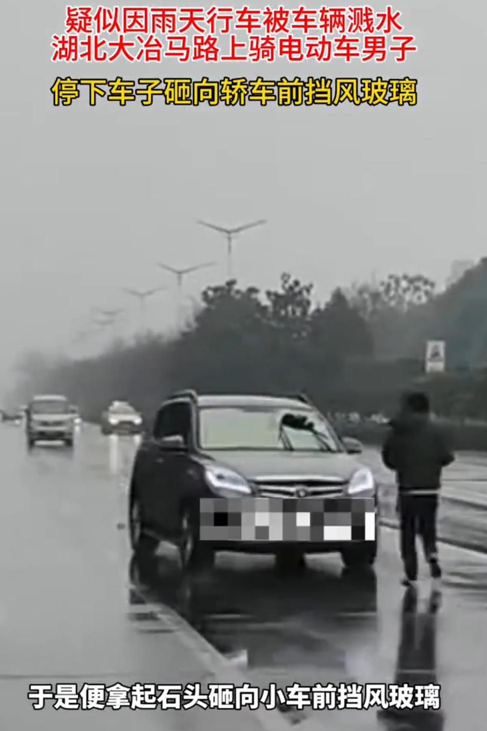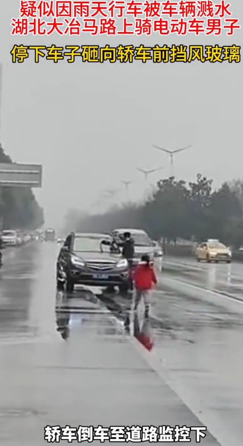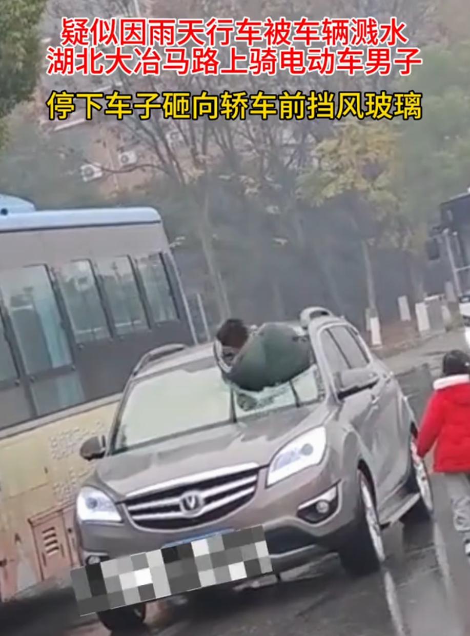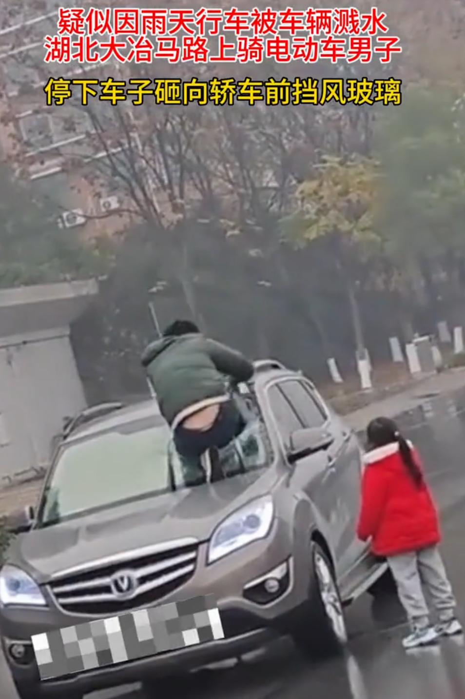 反转!网传父女骑车被溅一身水,拦停车辆怒砸挡风玻璃,不实。 事发12月20日湖北黄石,雨天一骑电动车男子,拦停一辆机动车,拿起石头怒砸小车风挡玻璃。 小车司机倒车至监控下,男子追着继续用石头砸,最终砸烂车挡风玻璃,人钻进驾驶室,有个小女孩全程在一旁哭。 以上就是网传视频,砸车是真的,父女也是真的,但不是因为雨天骑车被溅水,当事人出面辟谣说他们是一家人。 开车的是男子媳妇,当天两人因家庭矛盾发生了争吵,女的负气开车离家,男子骑车载着女儿追到该路段。 拦停了妻子的车辆,因争吵加剧,男子才做出不理智的行为,被路人拍下了视频传到网上,各种谣言版本出来。 当前已对夫妻俩做出了相应的处罚,当事人说网上流传视频,已对现实生活造成了困扰,希望大家不要以讹传讹。 砸车玻璃 小伙怒砸车玻璃