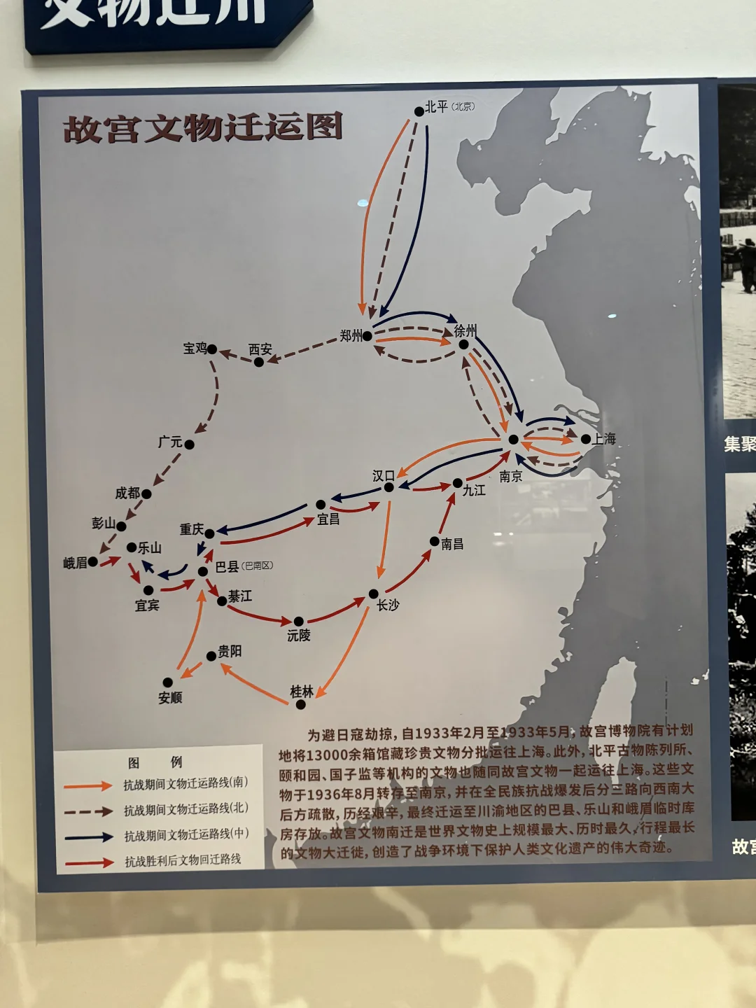 • 路线节点:1937年11-12月南京起运→船运至湖北汉口→1938年初转宜昌→逆江运抵重庆(分存7处库房)→1939年迁四川乐山安谷乡(藏于1寺6祠,存近8年)→1946年集中重庆→1947年底运回南京。