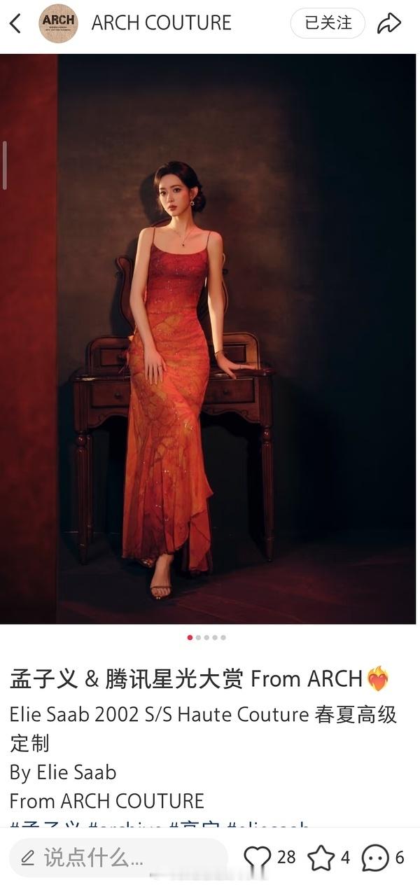 时尚博主夸孟子义星光大赏两套高定但孟子义穿的是Elie Saab 2002春夏定制系列,这套根本就不算高定,es 03年秋冬才入会的。孟子义穿ES 星光大赏出图 星光大赏红毯