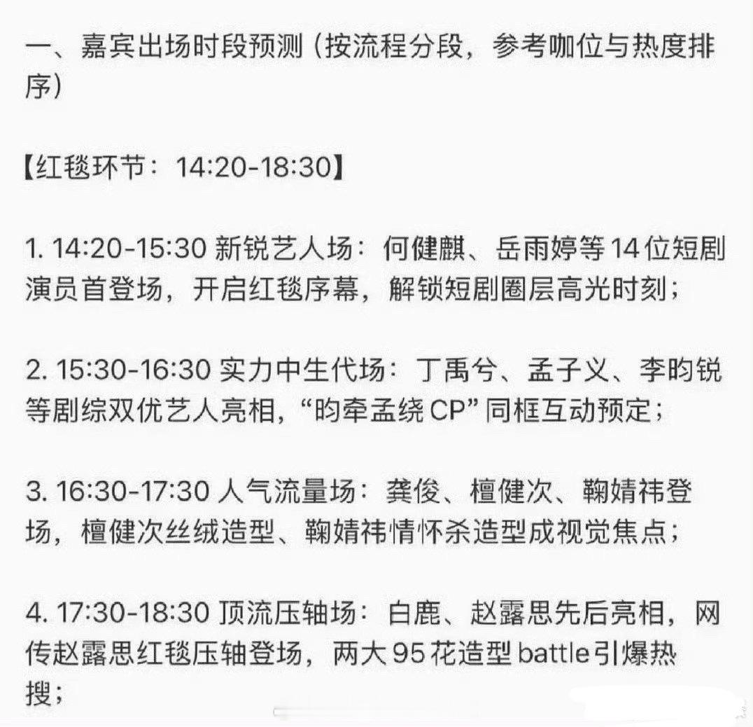 腾讯视频星光大赏 的流程:1️⃣短剧演员开场2️⃣丁禹兮、孟子义、李昀锐等实力中生代场,昀牵孟绕同框3️⃣龚俊、檀健次、鞠婧祎人气流量场4️⃣白鹿、赵露思上场,赵露思压轴 星光大赏的流程星光大赏红毯